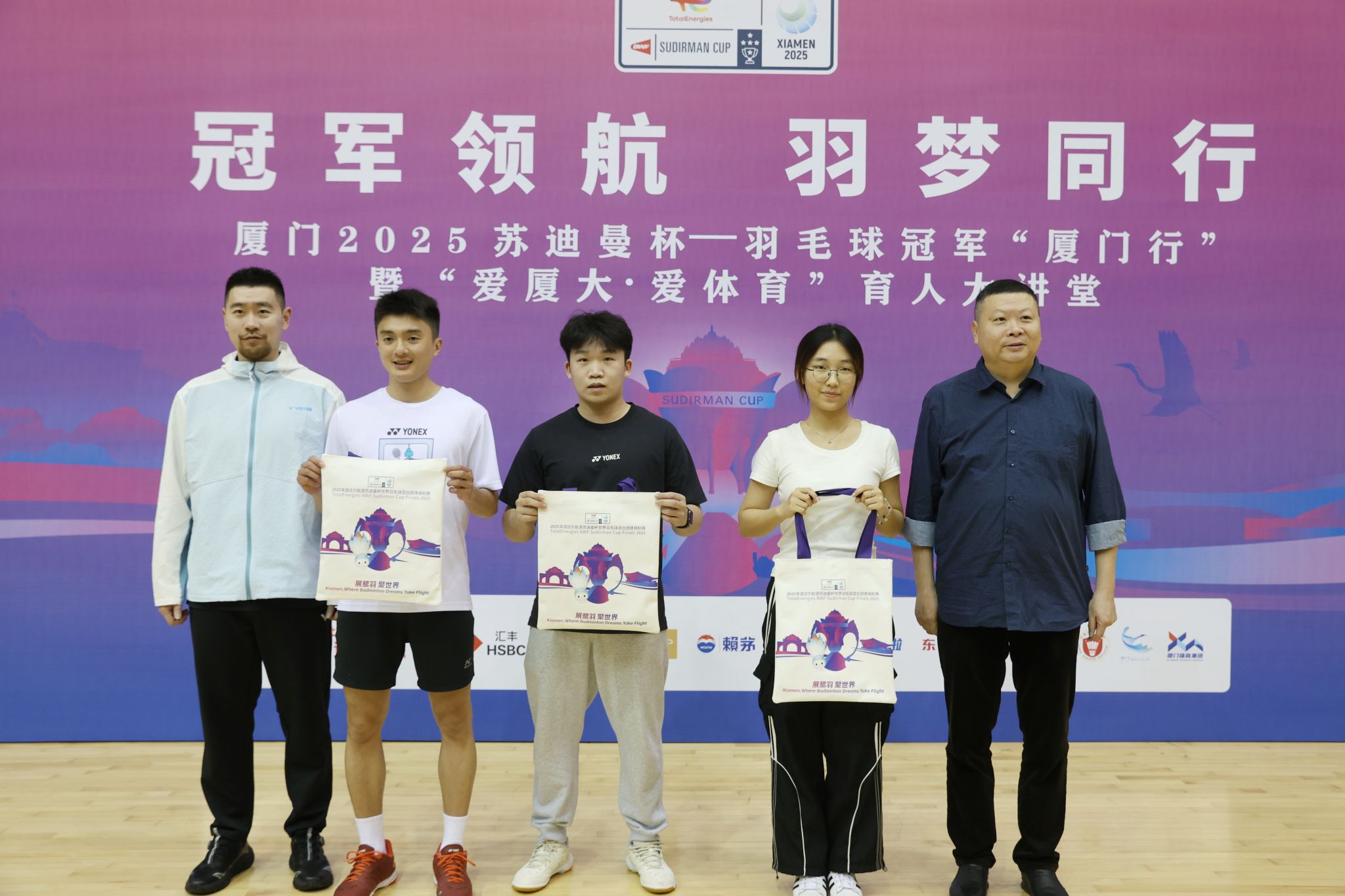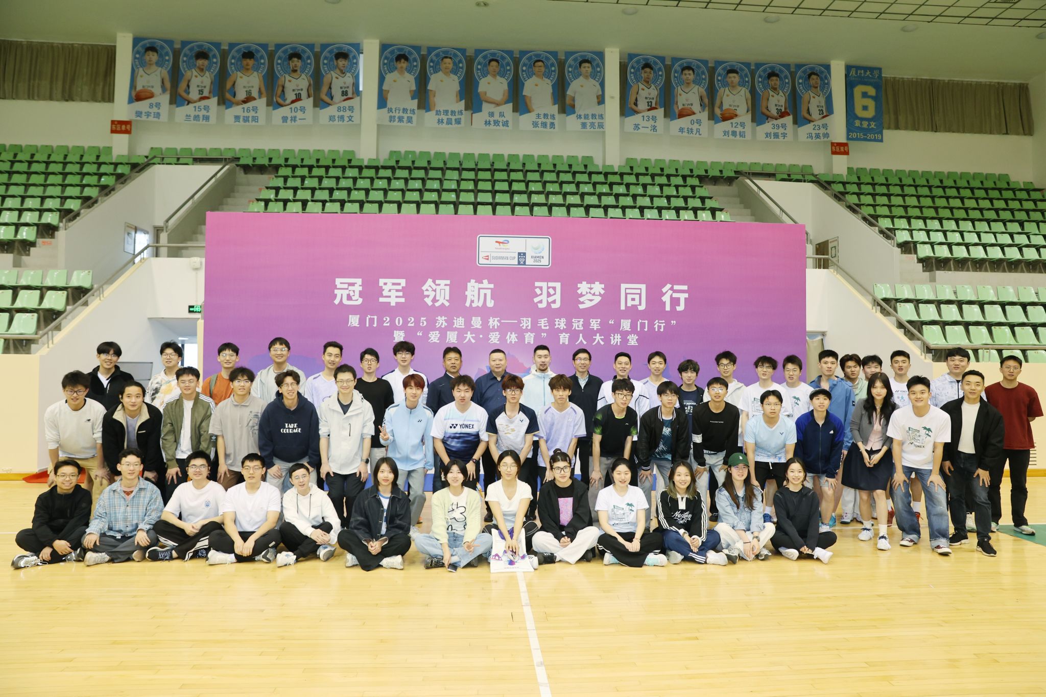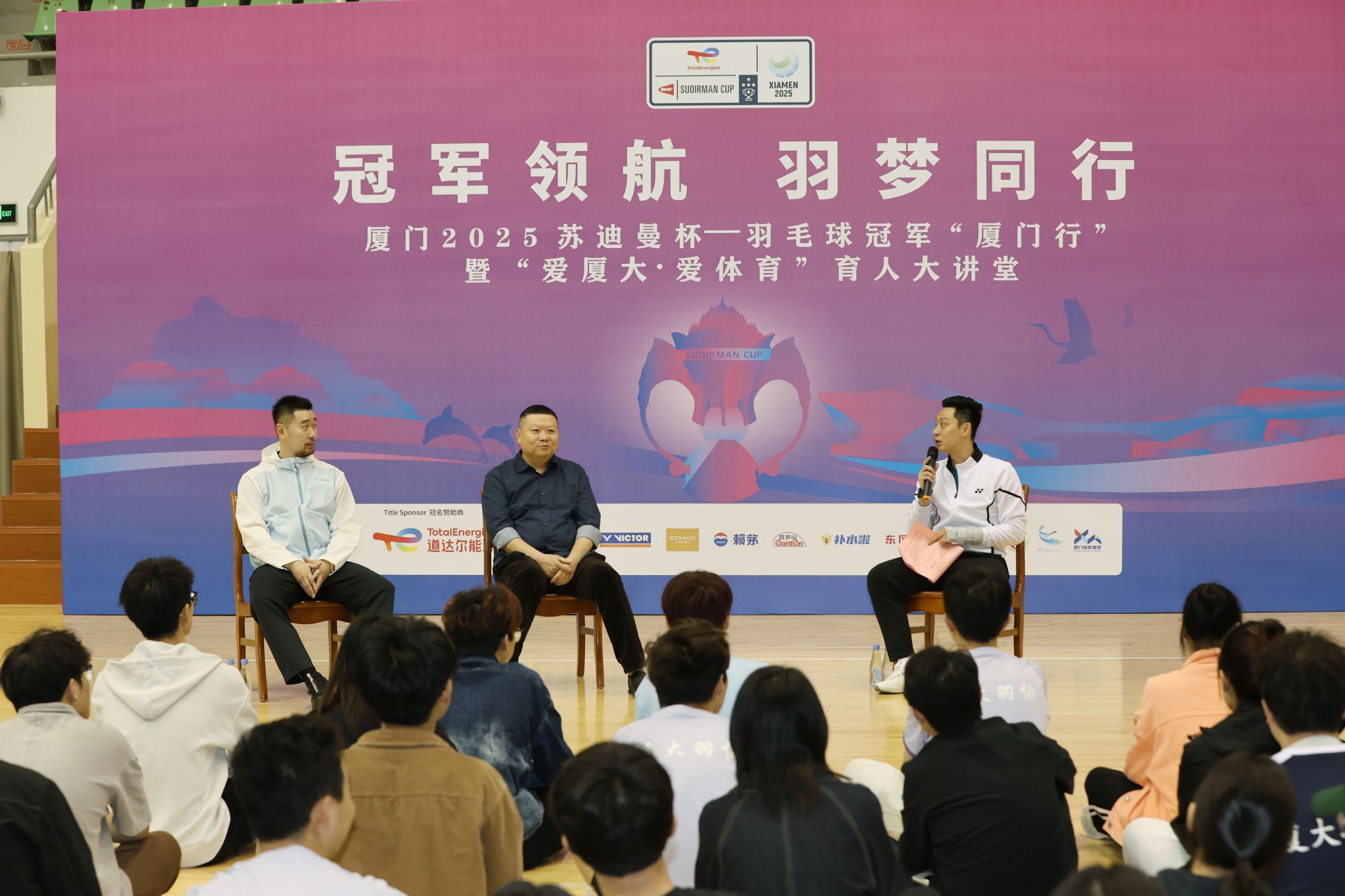 3月13日下午,奥运冠军吉新鹏和世界冠军刘成走进厦门大学校园,正式开启“冠军领航 羽梦同行”羽毛球冠军厦门行活动。本次活动是厦门2025苏迪曼杯赛的预热活动,也是厦门大学“爱厦大 爱体育”育人大讲堂第二讲,更是一场跨越竞技场与象牙塔的体育精神对话。活动由体育教学部教师、世界冠军刘小龙主持。