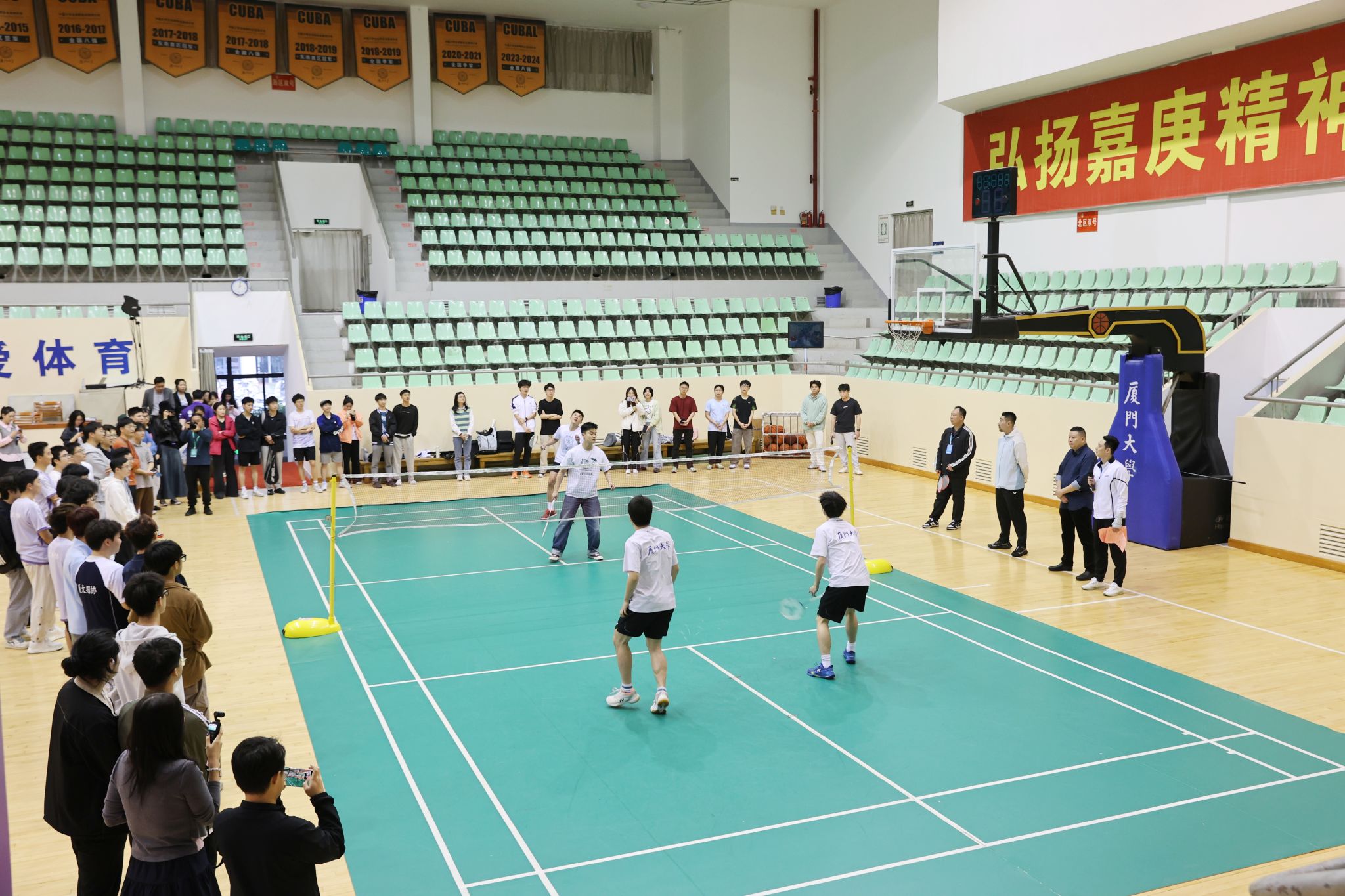 当天下午,吉新鹏和刘成来到厦门大学,首站参观了颂恩楼和芙蓉湖。从百年前校主陈嘉庚先生德智体“三育并重”的教育思想,到如今厦大校园体育运动蔚然成风,大家在参观中深切感受着体育精神的传承。“这座体育馆的木质地板见证过无数羽球少年的汗水。”在明培体育馆,曾获悉尼奥运会男单冠军的吉新鹏轻抚围栏感慨地说。在与师生的分享交流中,吉新鹏回忆起奥运决胜时刻:“当时打得很辛苦,但当我听到场边中国观众的加油声就觉得必须顶住。”在互动问答环节,双打世界冠军刘成揭秘了他的训练日常:“我和搭档每天要对墙抽球几百次,墙上印子最深的位置就是我们的‘成绩单’”,让在场师生深受触动。