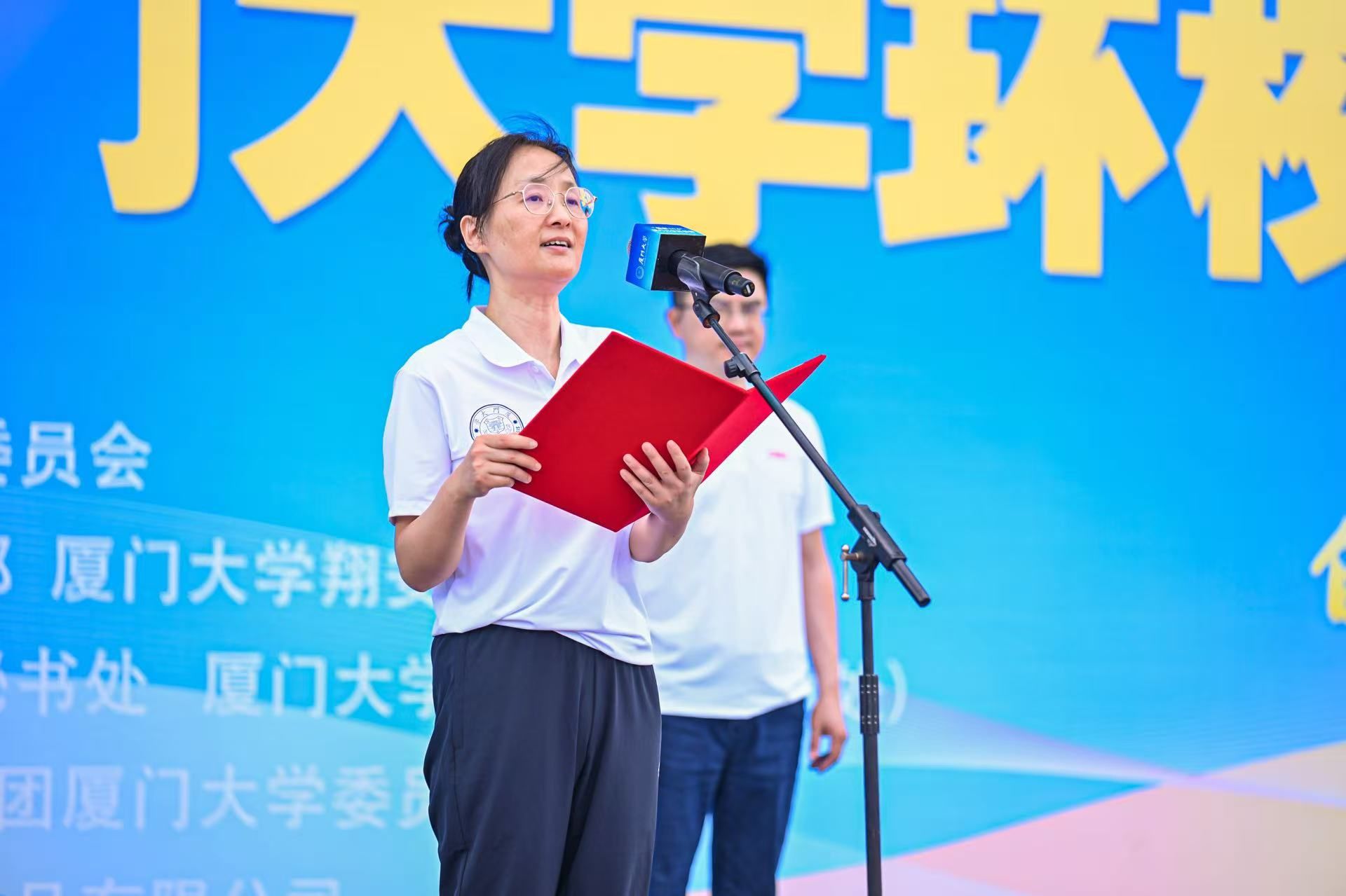 体育教学部党委书记刘钟南在翔安校区起跑仪式上致辞。她表示,本次环校跑活动是庆祝厦门大学建校104周年的重要活动之一,她希望,师生校友能在奔跑中享受运动的快乐,体会体育的魅力和价值,将体育精神融入到日常的学习和生活中,让健康的生活方式成为一种习惯,让积极向上的精神风貌成为厦大人最鲜明的标签。