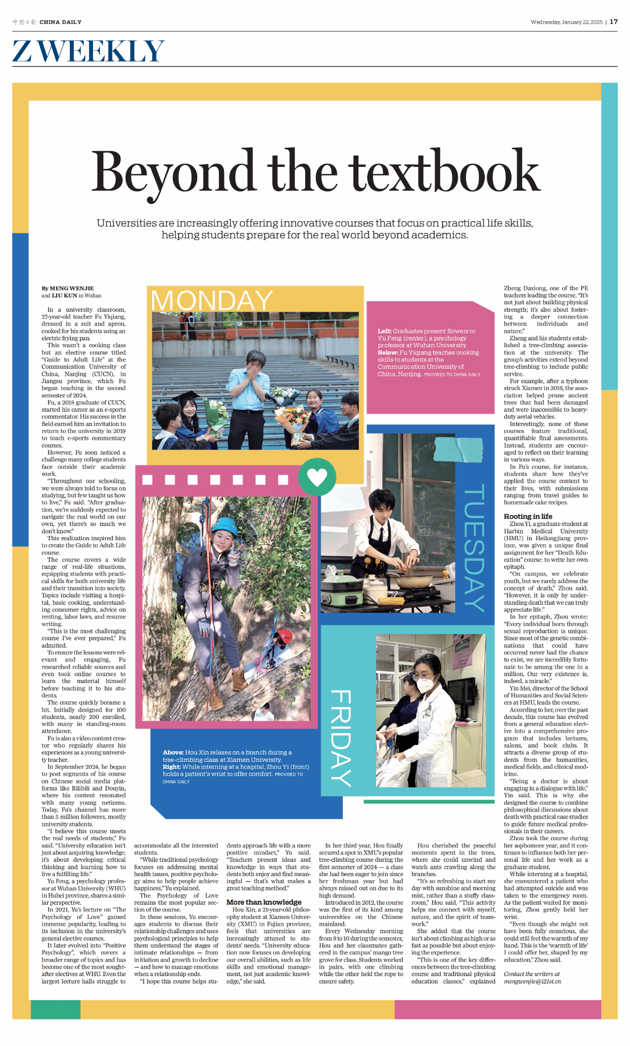 2025年1月22日,《中国日报》英文版发布了一篇名为《Beyond the textbook》的文章,介绍了越来越多的高校开设注重实践的创新课程,其中这样一张图片格外引人注目——一位同学穿戴安全设备、站在粗壮的树枝上、对着镜头微笑,这是在厦大攀树课中常见的一幕。而照片背后透露出课程的创新与挑战精神,不仅仅是为了锻炼学生的身体素质,更是为了培养他们的勇气、自信和解决问题的综合能力。大学体育课不是只能在象牙塔里,厦大攀树课对此给出了一个生动的示范。攀树课年年开,一届届学生来了又去,而他们攀过的树始终在厦园静静生长,见证着学子们的蜕变与成长。攀树课为大学体育课程设置“打开脑洞”,我们相信攀树课会越办越好,超越传统竞技、塑造青年勇气与品格新风尚的大学体育课将如雨后春笋般层出不穷。