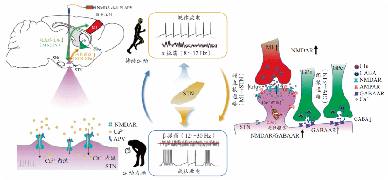 丘脑底核(Subthalamic Nucleus, STN)作为基底神经节的“发动机”,是超直接通路(M1—STN)和间接通路(GPe—STN)的交汇点,接收来自运动皮层的兴奋性输入和苍白球外侧部(GPe)的抑制性输入。其神经元活动的“兴奋-抑制平衡”直接决定了整个运动环路的输出状态。NMDA受体(兴奋性)与GABAA受体(抑制性)正是调控这一平衡的关键分子。然而,运动力竭状态下,STN内部的受体表达如何变化?这种变化是否驱动了β振荡的产生? 这些核心问题长期缺乏直接的实验证据。