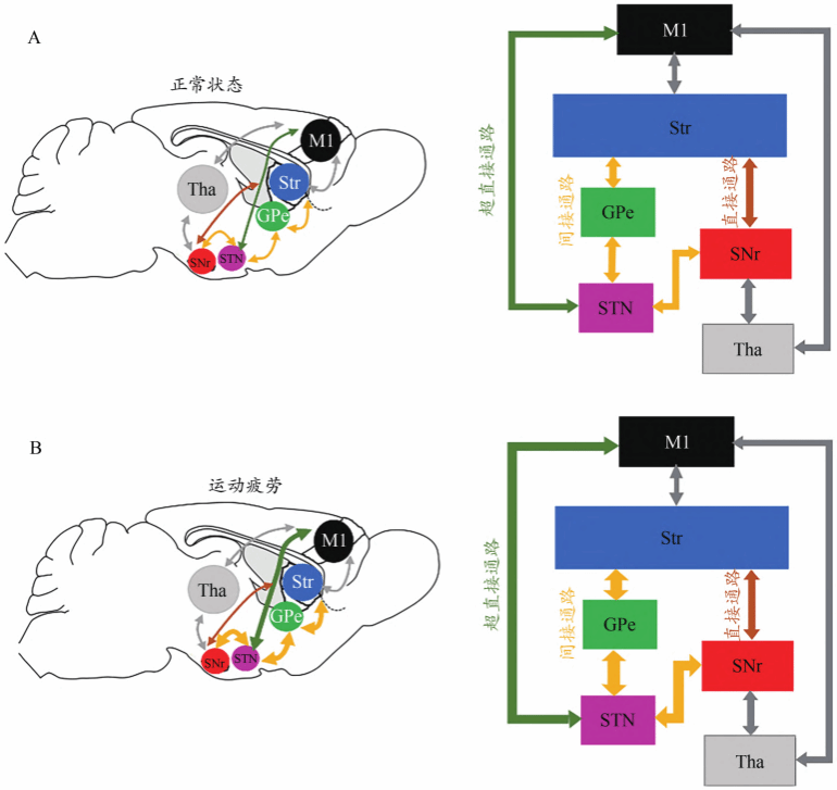 图1力竭运动状态下皮层-基底神经节通路功能连接失衡模式图