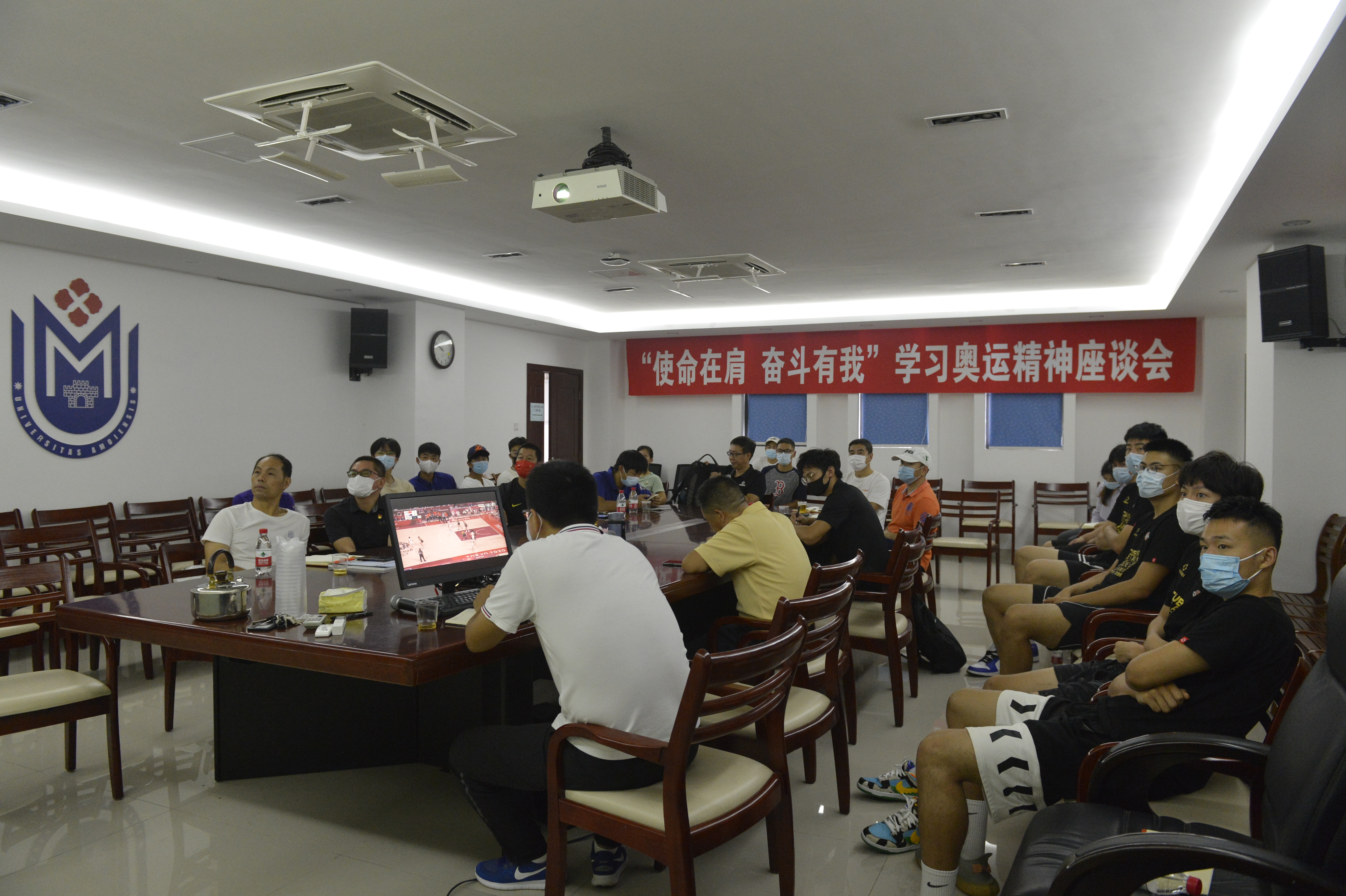 座谈会分为两个环节,首先,与会人员通过观看奥运会中国女篮对战澳大利亚比赛录像感受体会奥运精神,随后师生进行交流发言。