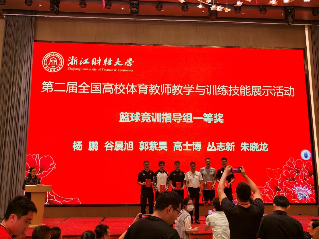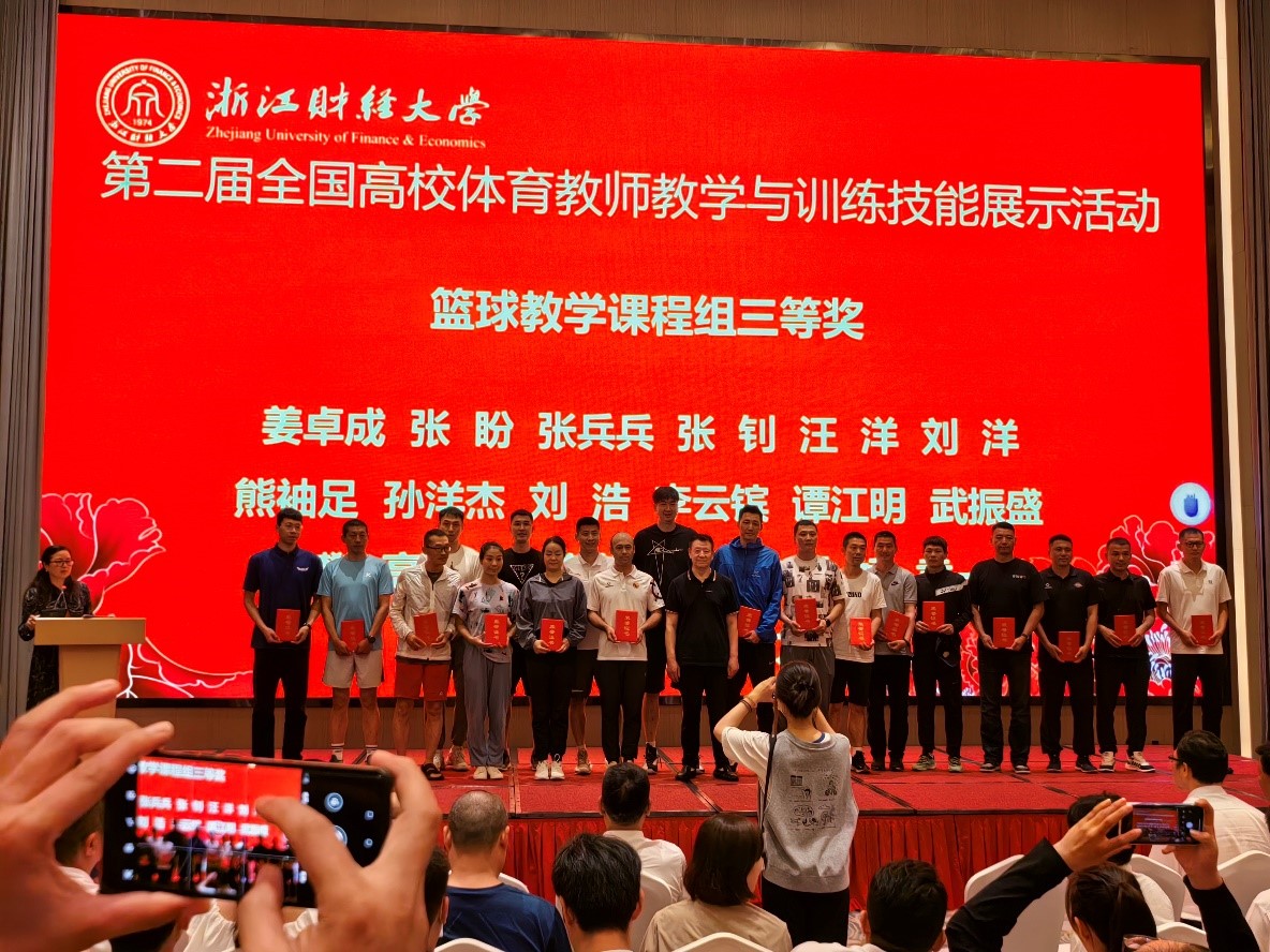 2023年5月25-28日,由教育部全国高等学校体育教学指导委员会主办的第二届全国高校体育教师教学与训练技能展示活动在浙江财经大学举办,本次大赛共吸引来自全国的28个省(区、市)及146所学校,总计195人全国正式在编体育教师参与。我校由领队翁兴和副主任带领两位教师参加篮球项目,其中郭紫昊老师荣获篮球竞训组一等奖,谭江明老师荣获篮球教学组三等奖。