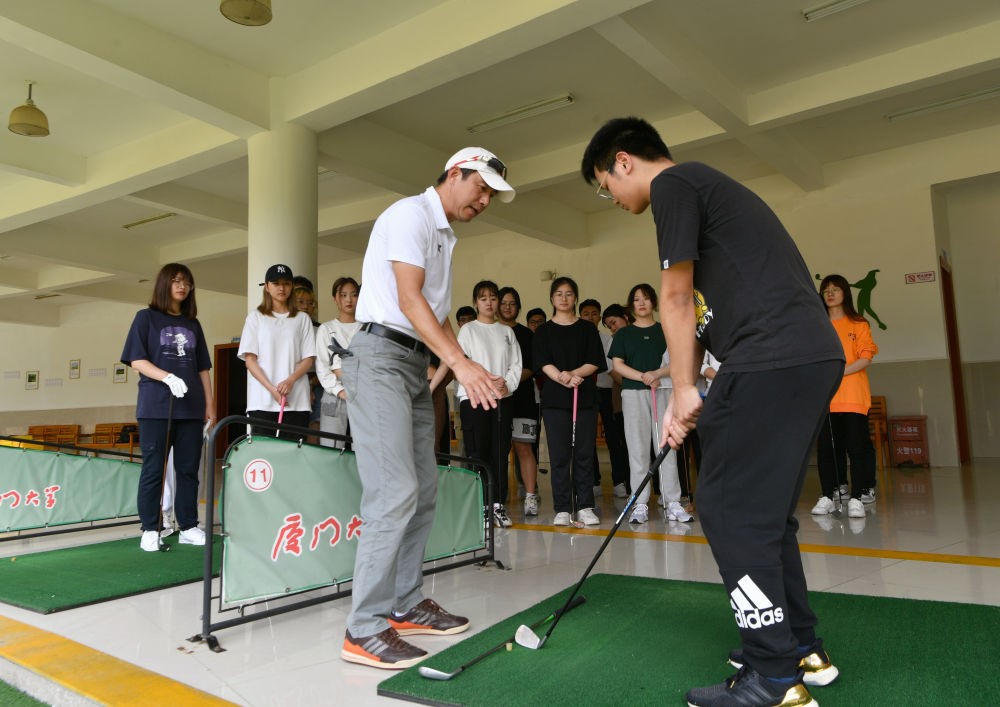 2021年4月1日,在厦门大学的高尔夫球课上,副教授颜六亿(前左)教学生练习发球。新华社记者 魏培全 摄