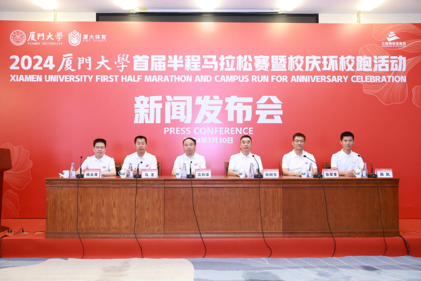 春意盎然,相约厦大。3月30日,“2024厦门大学首届半程马拉松赛暨校庆环校跑活动”新闻发布会召开。厦门大学党委常委、宣传部/教师工作部部长高和荣、厦门大学体育教学部党委书记郑树东、厦门大学后勤集团党委书记翔安校区管委会副主任马龙、厦门大学漳州校区管委会副主任张军奎、厦门大学嘉庚学院党委副书记杨云良、厦门大学体育教学部党委副书记曾天从、厦门大学体育教学部副主任吴飞腾、三角梅体育集团(厦门)有限公司总经理韩风出席发布会,厦门大学学生工作部、厦门大学校友总会秘书处、共青团厦门大学委员会均派代表参加发布会,发布会由高和荣主持。