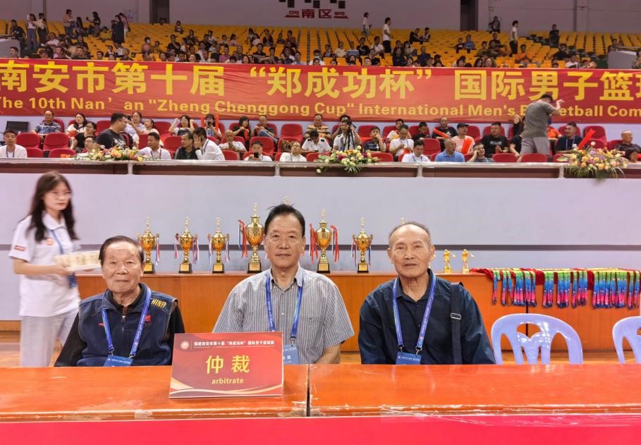 何德馨(中)担任南安市第十届“郑成功杯”国际男子篮球赛仲裁