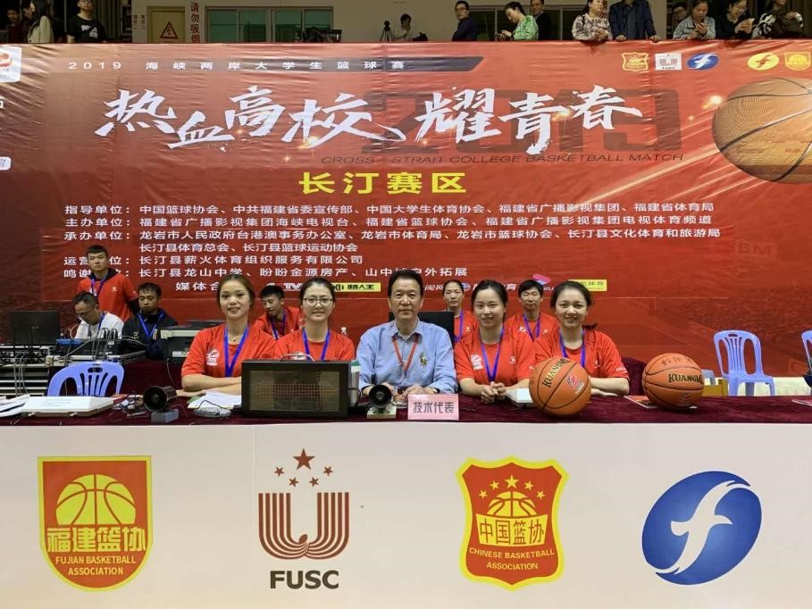 何德馨(中)担任2019海峡两岸大学生篮球赛技术代表