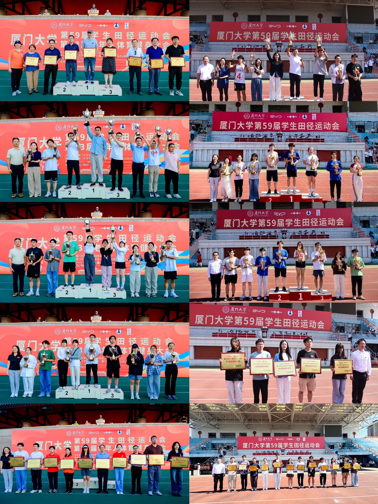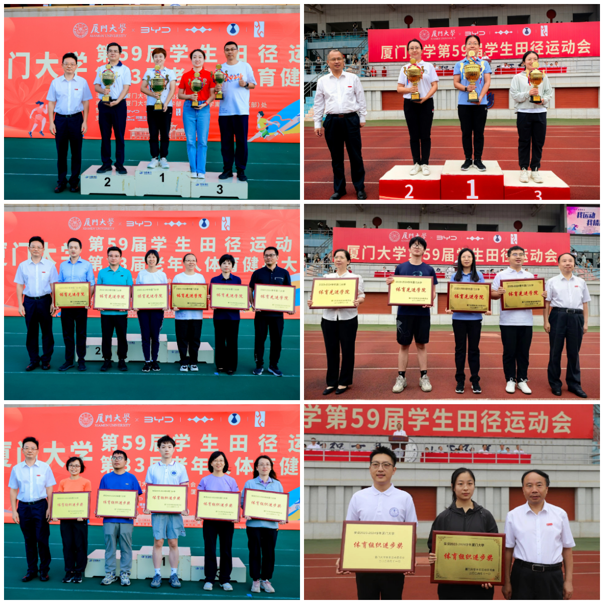 经过两天精彩而激烈的角逐,管理学院以5685.5分获得学生田径运动会思明赛区本研团体总分第一名,经济学院、化学化工学院、物理科学与技术学院、法学院、建筑与土木工程学院、材料学院、外文学院分别位列第二名至第八名。医学院以6086分获学生田径运动会翔安赛区本研团体总分第一名,电子科学与技术学院、海洋与地球学院、信息学院、公共卫生学院、航空航天学院、生命科学学院和环境与生态学院分别位列第二名至第八名。老年人体育健身大会团体总分前八名分别为资产与后勤管理处、资产经营公司、化学化工学院、离退休工作处、体育教学部、海洋与地球学院、物理科学与技术学院、人事处。创新与创意学院、经济学院、电子科学与技术学院等十五个学院获学生田径运动会体育道德风尚奖。管理学院、航空航天学院等获八段锦课间操展示评比一等奖。校领导和有关单位负责人为获奖团体及单位颁奖。