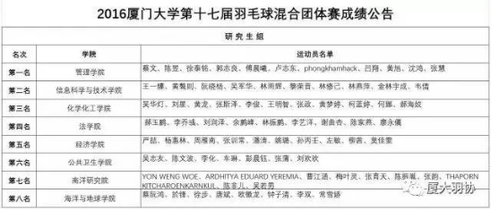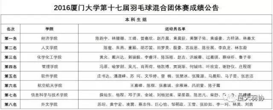 至此,2016.11.21至2016.12.18第十七届厦门大学羽毛球混合团体赛正式落下帷幕,让我们期待来年的比赛。