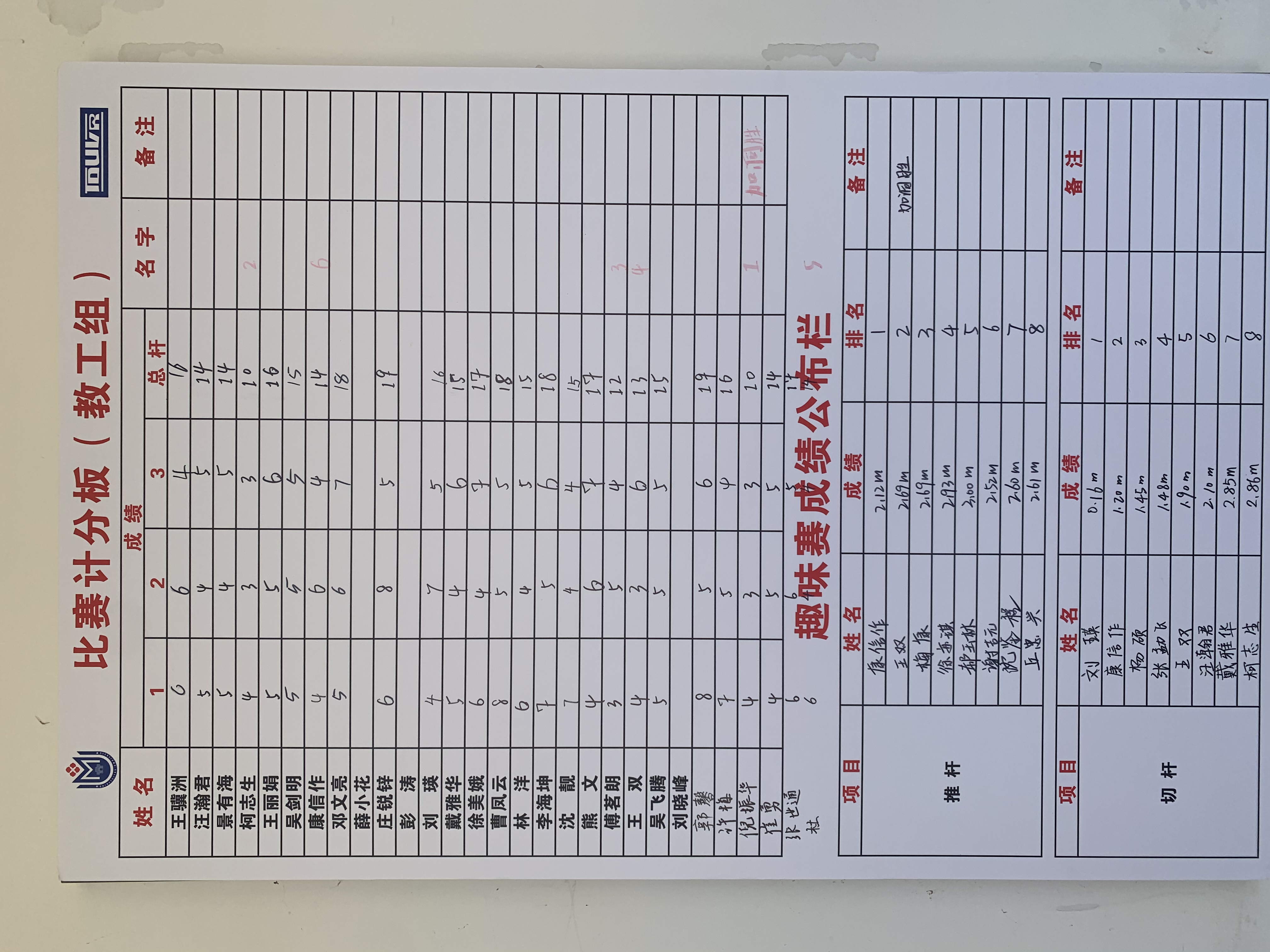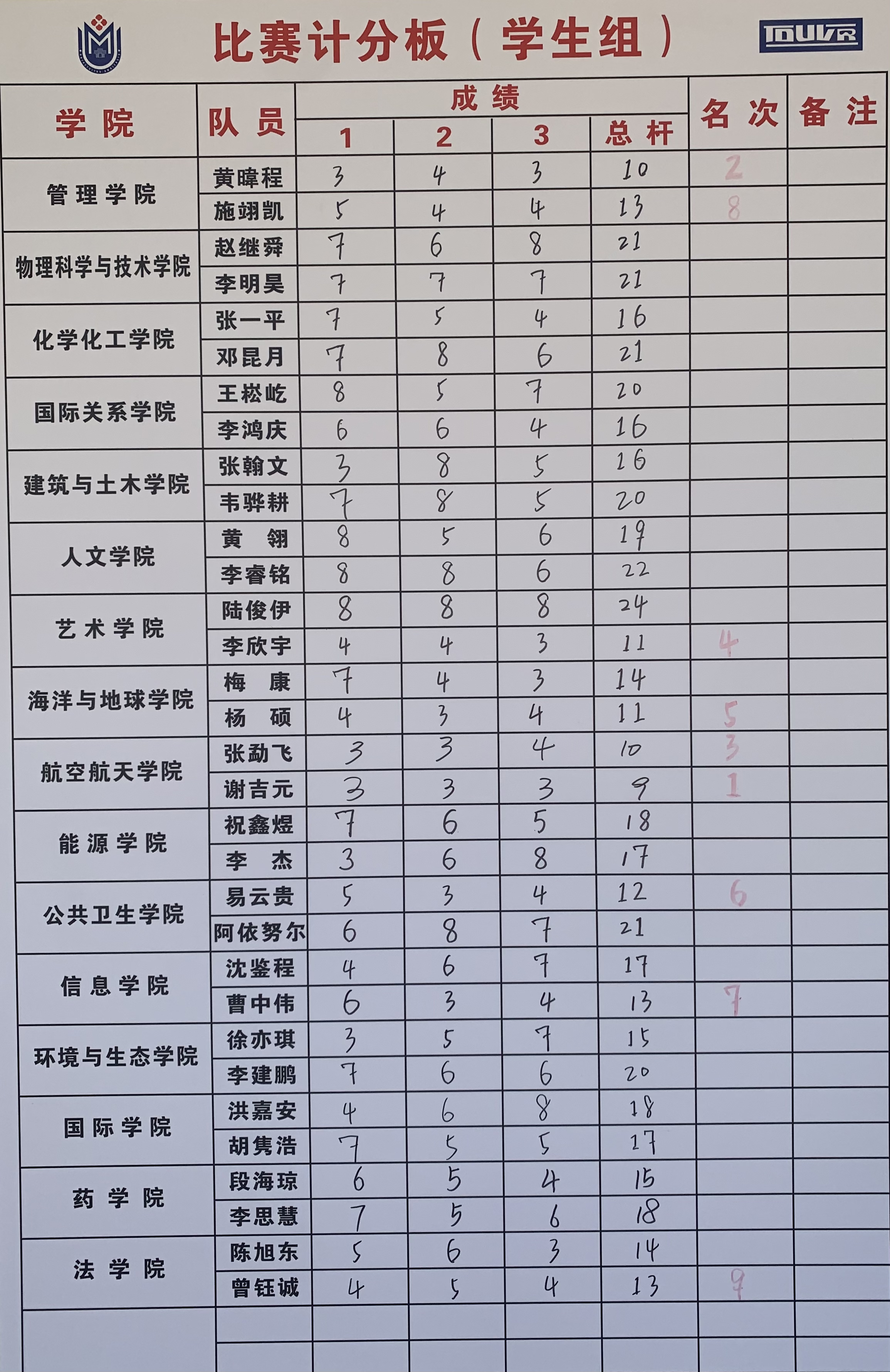 当天12时,教职工组个人比杆赛开始,参赛的29名教职工分成8组展开厮杀,比赛过程精彩纷呈,多场强强对话十分吸睛。排名第一更是出现了杆数完全相同的情况,需通过加洞赛分出胜负,最终体育教学部倪振华老师以1杆优势险胜保卫处柯志生老师,夺得教职工组个人总杆冠军。