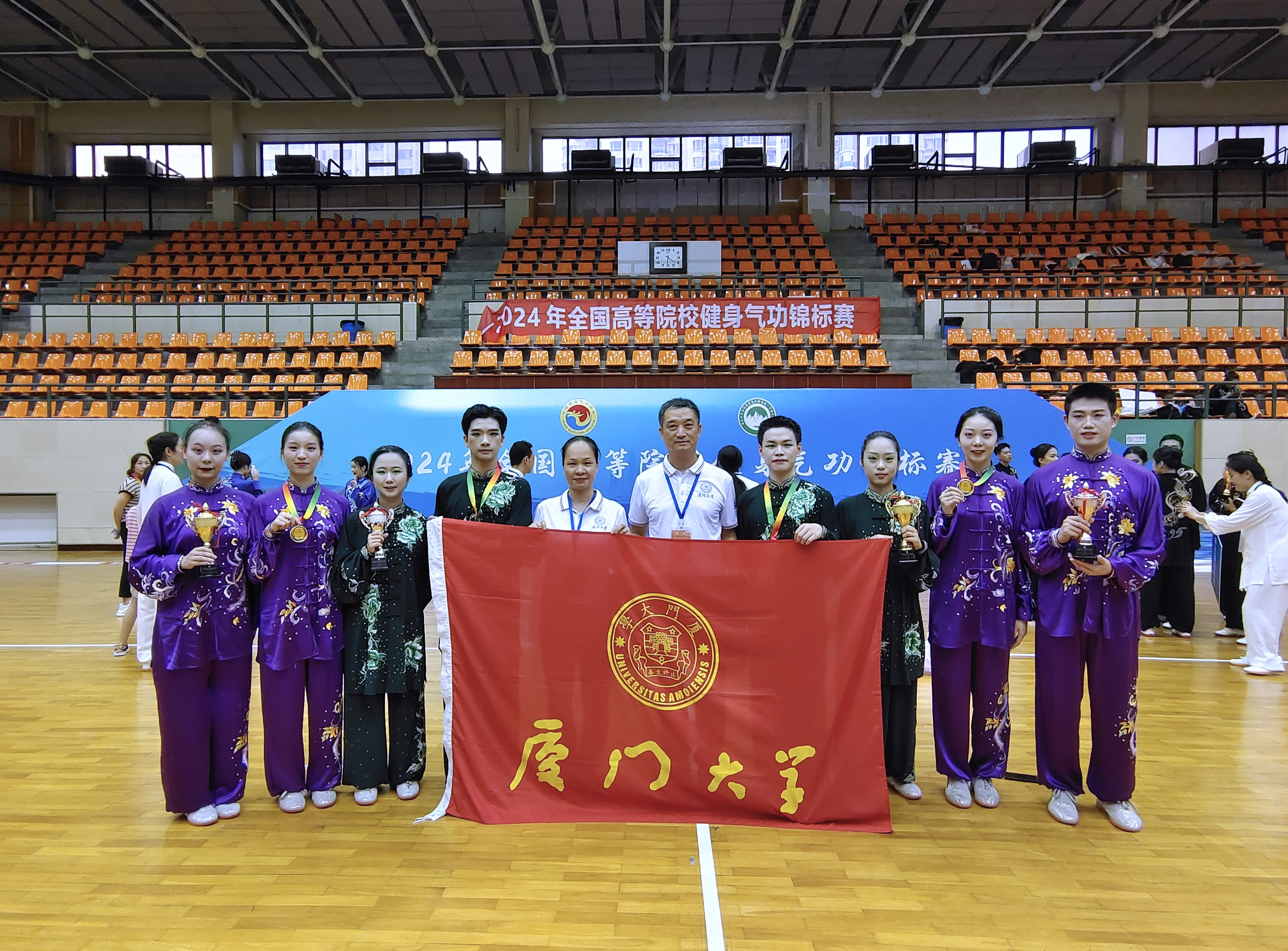 依托厦大健身气功协会、健身气功队,广大师生长期推广、着力建设我校 “一校一品”民族传统体育项目健身气功八段锦。在本次备赛参赛过程中,队员们在指导老师李仁松、方爱珠的带领下,共同度过了无数个集训的日夜,并克服了外地参赛的重重困难。我校学子在2024年全国高等院校健身气功锦标赛中的出色表现,充分展示了厦大学子的精神风貌和体育竞技水平,也为推广、宣传健身气功这项传统体育运动做出了积极贡献。