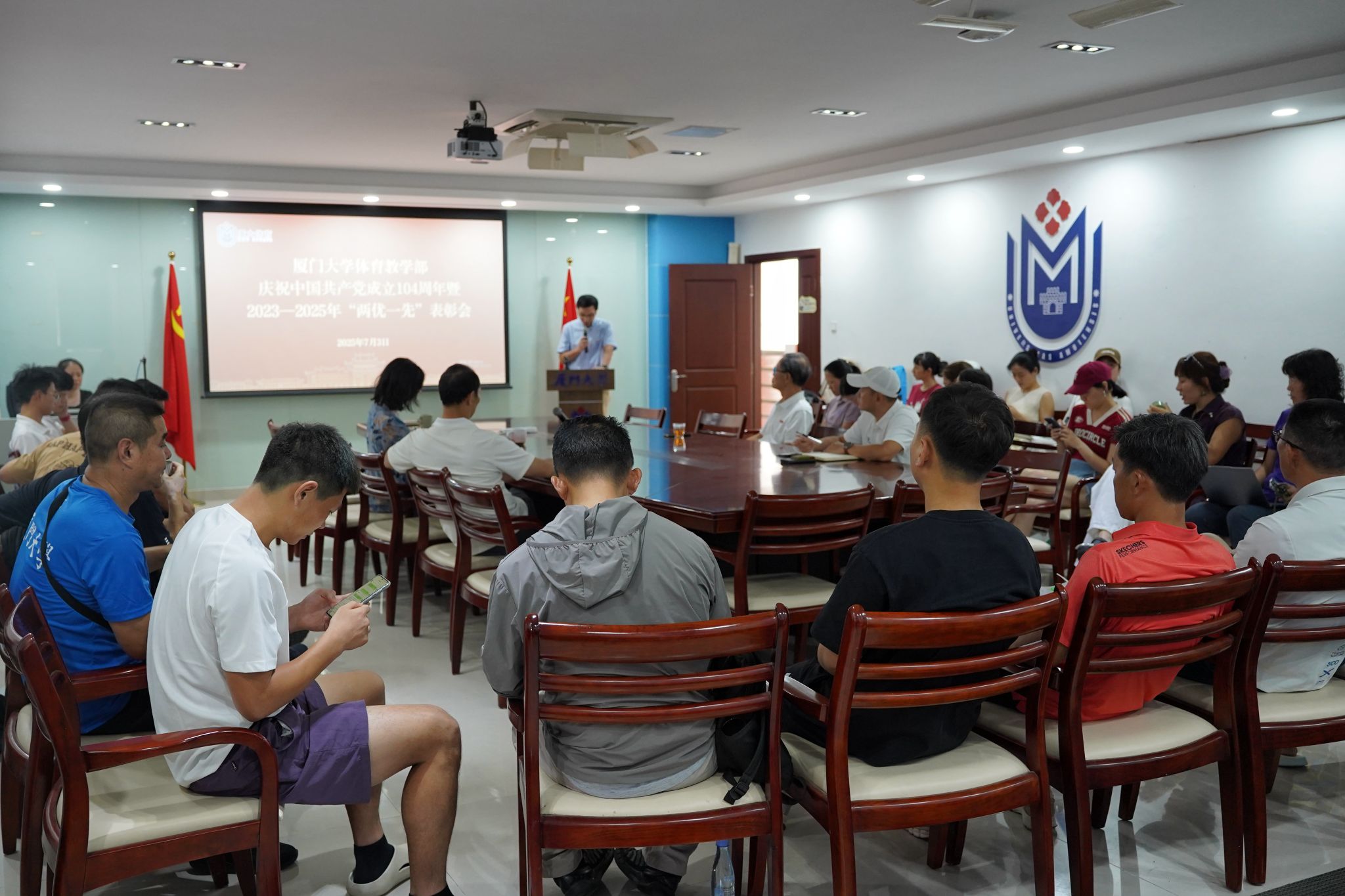 为推动深入贯彻中央八项规定精神学习教育走深走实,营造创先争优、奋勇拼搏的浓厚氛围,7月3日下午,体育教学部在王清明游泳馆三楼大会议室举行庆祝中国共产党成立104周年暨2023-2025年“两优一先”表彰会,激励全体师生以实干担当推动体育教育事业高质量发展。体育教学部领导班子成员、党委委员、全体教职工、离退休党员代表及学生代表共同参会。会议由部党委副书记曾天从主持。
