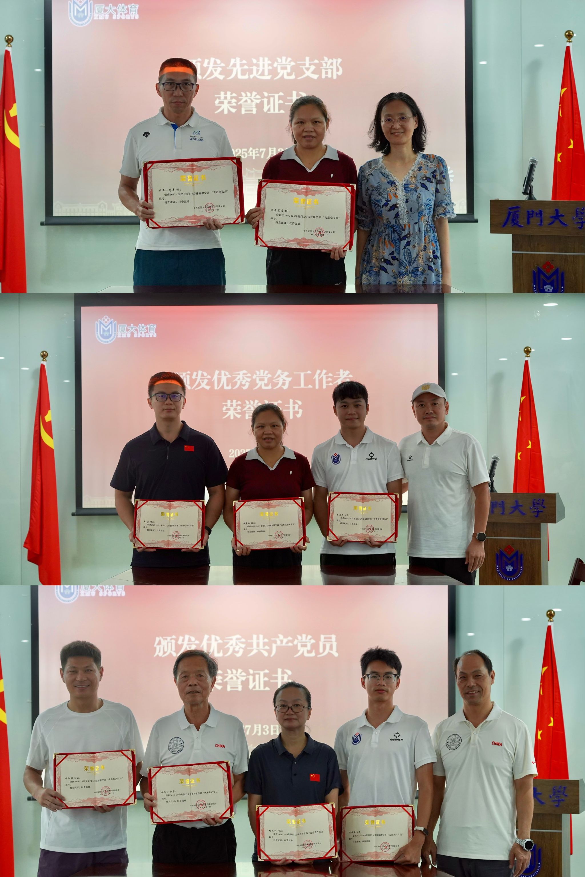 会上,部党委书记刘钟南宣布获得厦门大学2023-2025年优秀共产党员、优秀党务工作者名单,王鹏获评“厦门大学优秀共产党员”,张锡臻获评“厦门大学优秀党务工作者”;宣读《关于表彰厦门大学体育教学部2023-2025年优秀共产党员、优秀党务工作者、先进党支部的决定》,谭江明、黄浩洁、胡立虹、林清江、冯承墘等5名同志获评“体育教学部优秀共产党员”,黄惠玲、孟蒙、李春早等3名同志获评“体育教学部优秀党务工作者”,武术党支部和球类一党支部获评“体育教学部先进党支部”。刘钟南、部副主任吴飞腾、翁兴和分别为获奖集体和个人颁发荣誉证书。