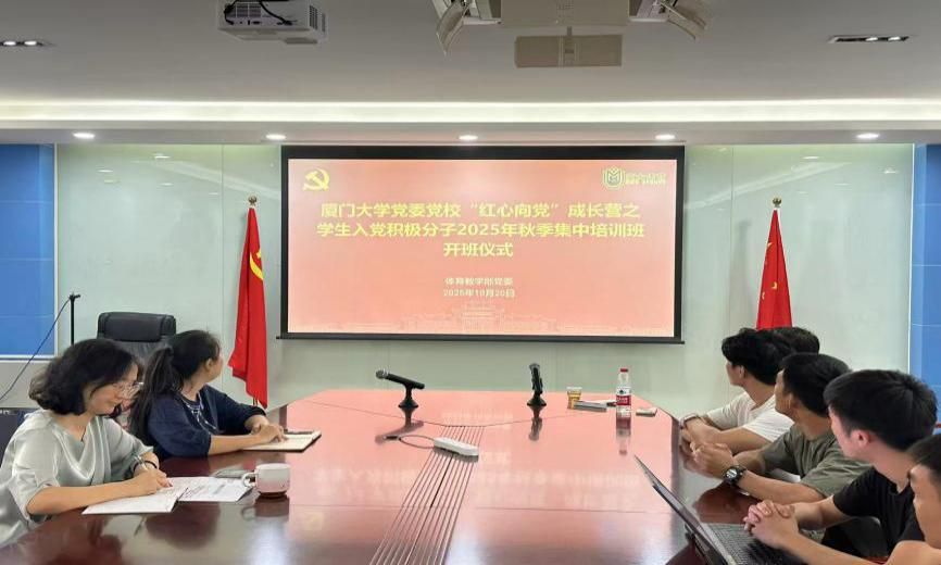 为深入学习贯彻习近平新时代中国特色社会主义思想,贯彻落实党的二十届三中全会精神和全国教育大会精神,进一步提高入党积极分子的思想政治素质和理论水平,10月20日下午,体育教学部党委党校“红心向党”成长营之学生入党积极分子2025年集中培训班开班仪式在王清明游泳馆三楼大会议室举行。部党委书记刘钟南、党务秘书张锡臻和6名学生入党积极分子等参加开班式。开班式由张锡臻主持。
