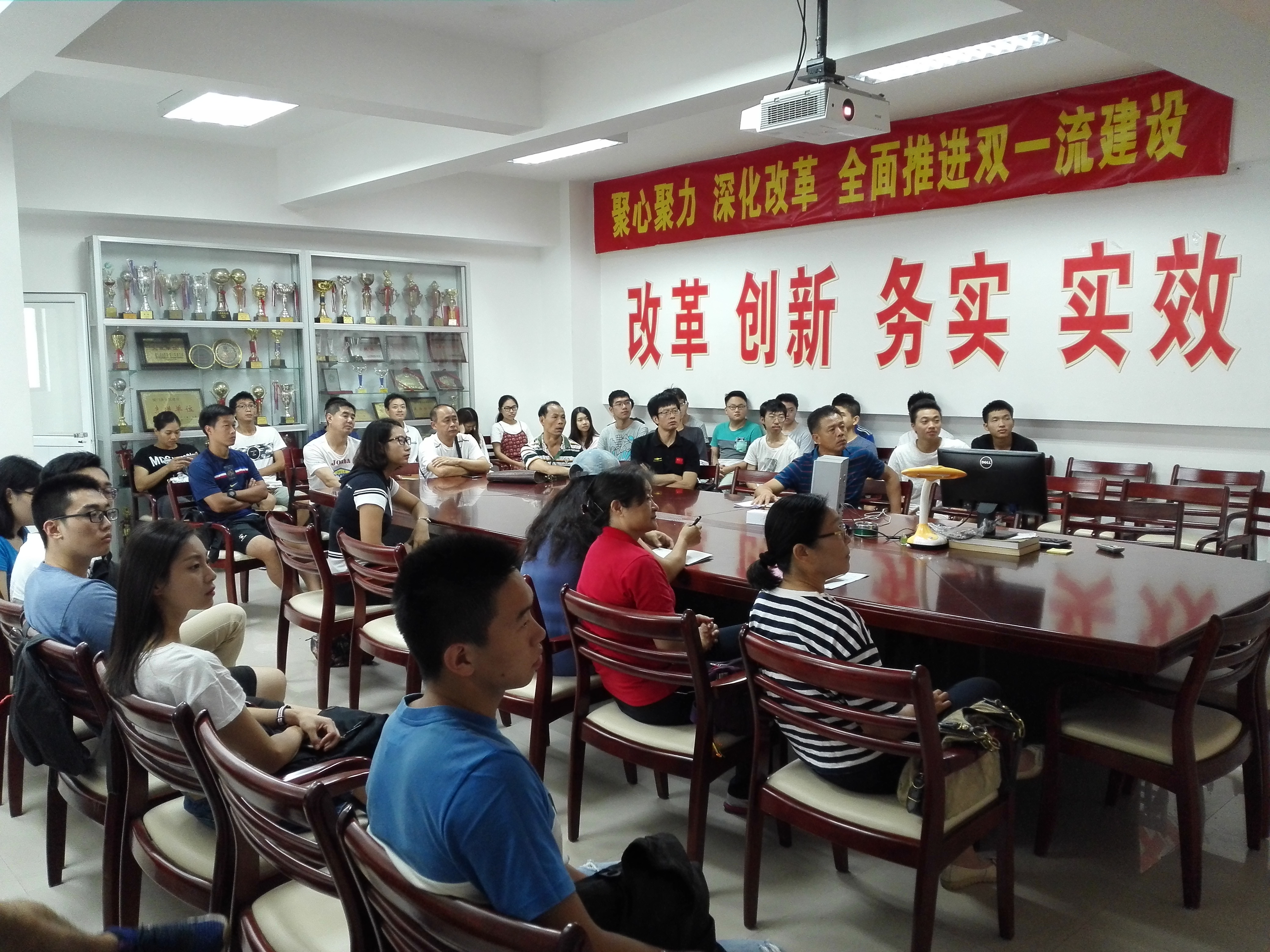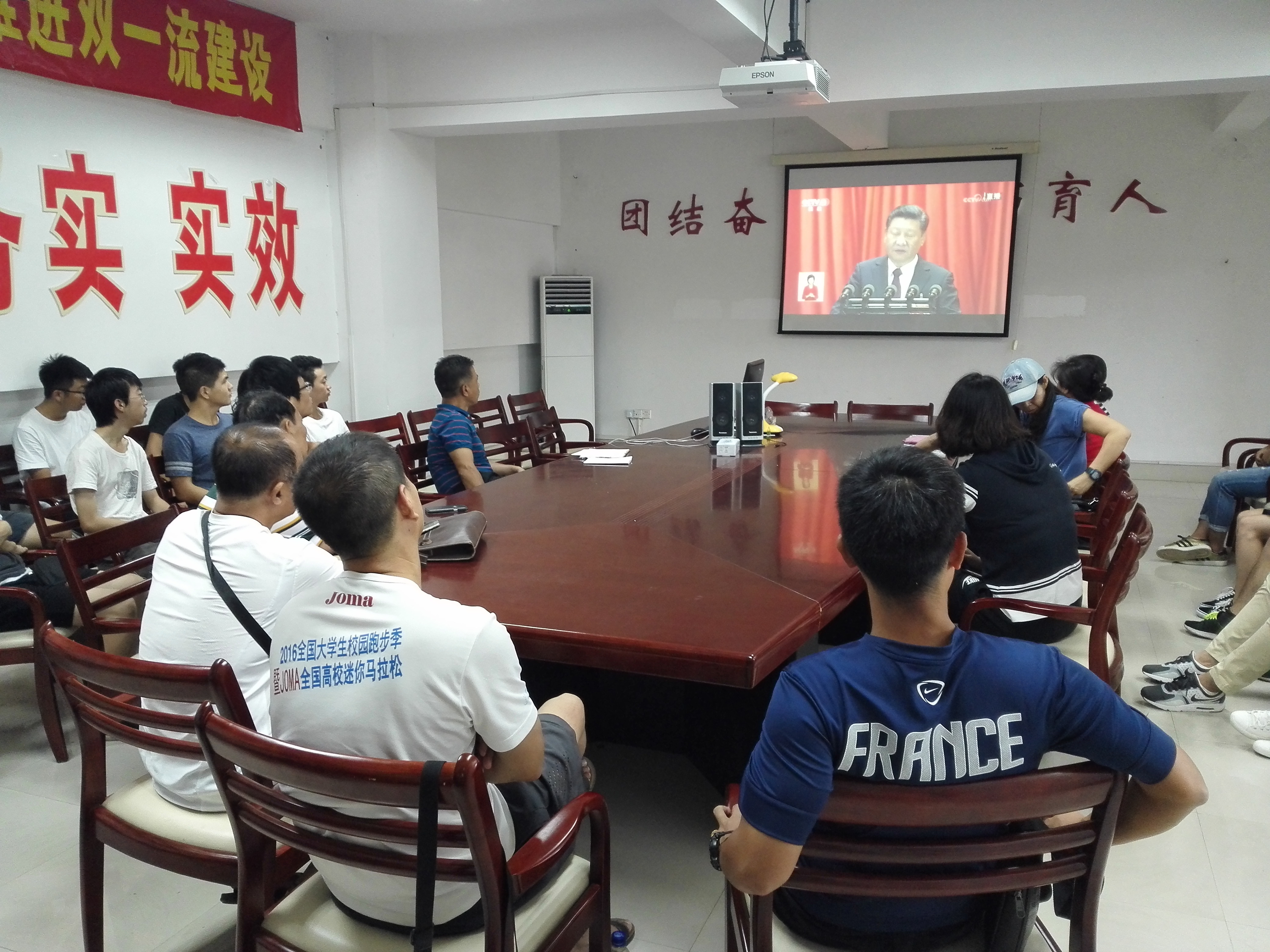 2017年10月18日上午9时,厦门大学体育教学部党委组织全体教工、学生党员及部分党外人士一同观看党的十九大盛况。党委书记郭琼珠主持会议。