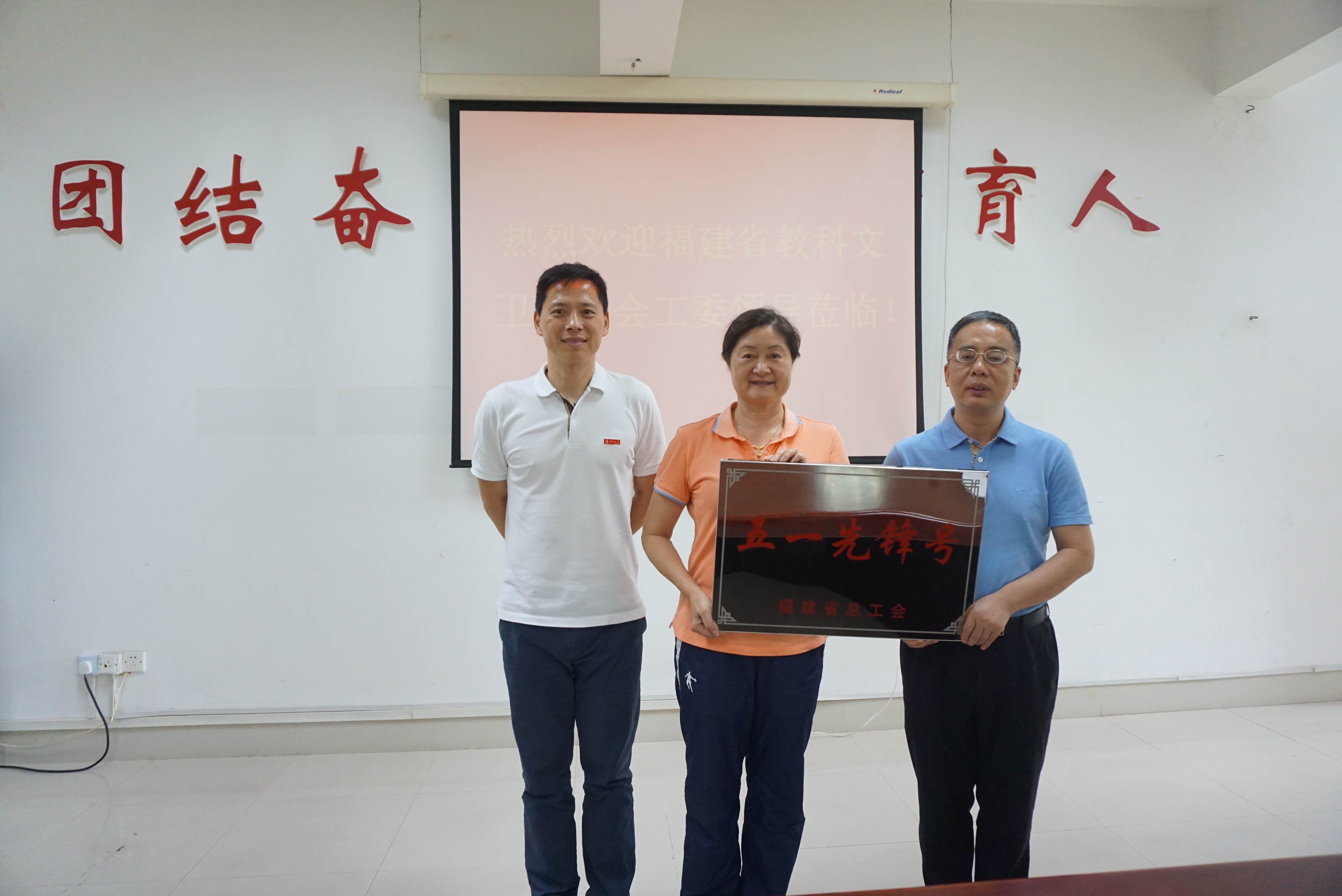 郭立新主任了解了我部的教职工工会情况,传达《福建省总工会关于表彰2017年福建省五一劳动奖的决定》,并向体育教学部部门工会颁发“福建省五一先锋号”奖牌及证书。体育教学部党委书记郭琼珠、体育教学部党委副书记兼工会主席陈华分别代表体育教学部工会接受了奖牌及证书,体育部党委书记郭琼珠代表体育部感谢省总工会、省文卫体工会、厦门大学工会一直以来对体育部部门工会的关怀和支持,表示将继续努力,发挥我部特色为我省、我校的“十三五”建设贡献力量。