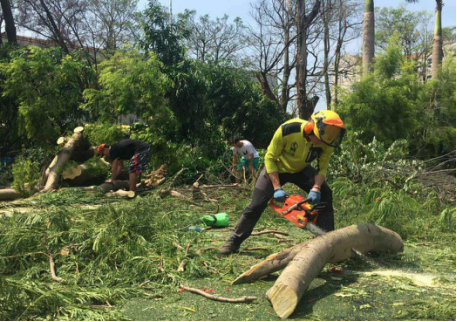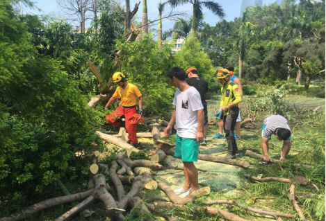 9月15号天一亮攀树队郑达雄老师就带领队员巡看校内树木情况,发现校内树木倒塌、断枝、阻塞道路严重,便立即向厦大后勤部申请帮忙清理倒塌树木,在收到后勤需要助援的回复后,攀树队当即集结5名资深队员带上队里的油链锯和装备火速赶往现场支援,树上树下“翻飞”,手持油链锯修剪树木。