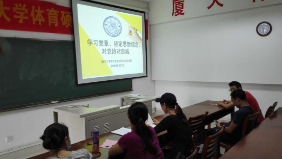 2016年5月23日,体育教学部研究生党支部在王清明游泳馆三楼多媒体教室开展了“两学一做”学习教育。本次活动以“学习党章,坚定理想信念,对党忠诚”为主题,由党支部书记胡立虹主持,党支部除两名请假的同学以外,全体成员参加了此次学习。