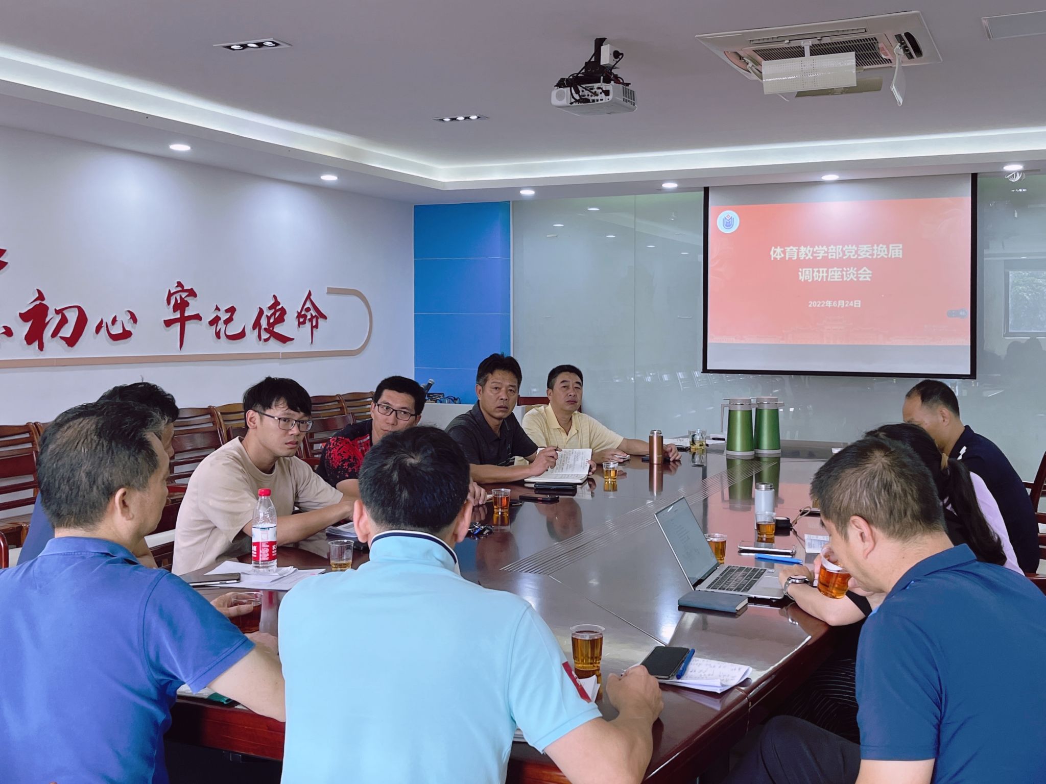 为做好基层党委换届选举工作,按照学校党委整体部署,体育教学部党委先后召开5场党委换届工作专题系列调研座谈会,邀请相关学院党委副书记、辅导员,教研室党支部书记、中心和教研室正副主任、专任教师、教练员、社团指导教师、党政管理后勤人员、离退休教师、学生代表等参会。部党政班子全体成员参会,会议分别由部党委书记郑树东、部主任林致诚主持。