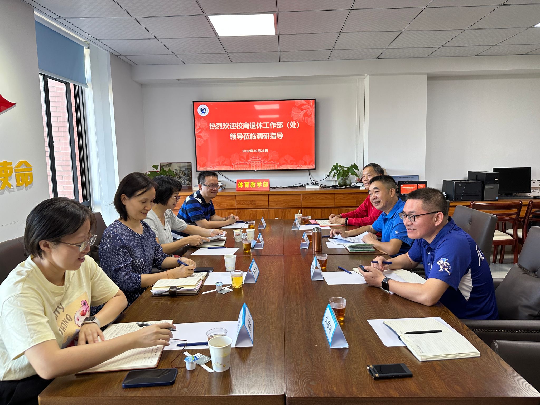 10月28日下午,校离退休工作部(处)部长曾坤瑜,副部长贺文英,秘书沈辛毅、陈秉心一行莅临体育教学部,调研指导我部离退休工作。部党委书记郑树东,党委副书记刘建敏,离退休党支部书记林清江,党务秘书张锡臻等参加调研座谈会。