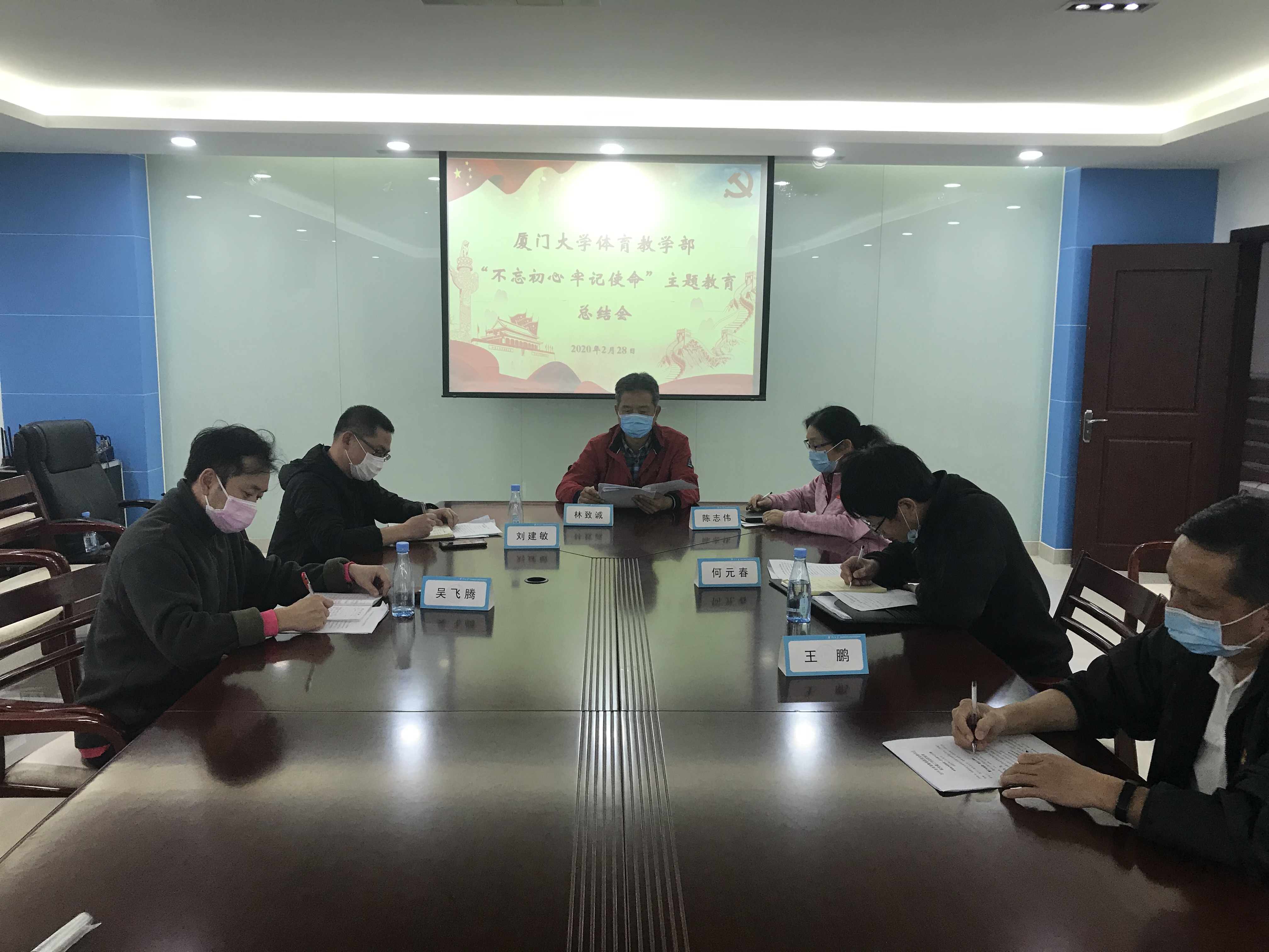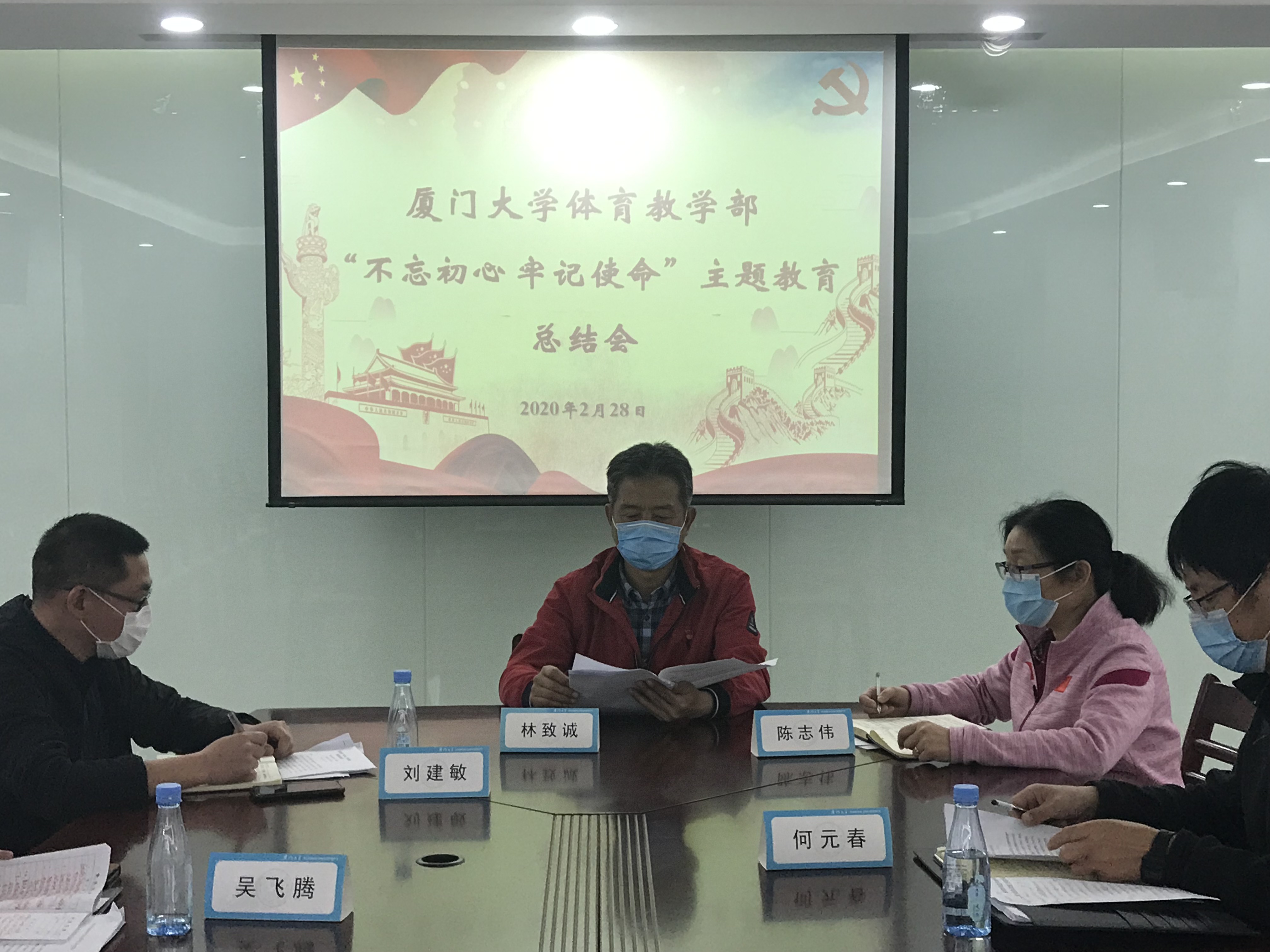 林致诚指出,经过深入开展主题教育,全体党员尤其是党员领导干部对习近平新时代中国特色社会主义思想的理解更加深刻,进一步筑牢了信仰之基,补足了精神之钙,锤炼了忠诚的政治品格,强化了担当作为意识、激发了干事创业热情。部党委积极将主题教育与“立德树人”、“体育育人”根本任务相结合,发挥专业特长,开展志愿服务、党支部立项等多形式活动,增强全体师生“守初心、担使命”的意识和担当。疫情防控工作中,党员突击队发挥“先锋模范”作用,为增强师生体质,提高抵抗疾病的能力,保证老师同学们不出门就能进行体育锻炼,精心准备,推出厦大体育“宅”运动系列推送12期,阅读量2万多人次,涵盖太极、瑜伽、健身操、形意养生功、力量训练、八段锦、六字诀等专题,有效帮助广大师生足不出户锻炼身体。