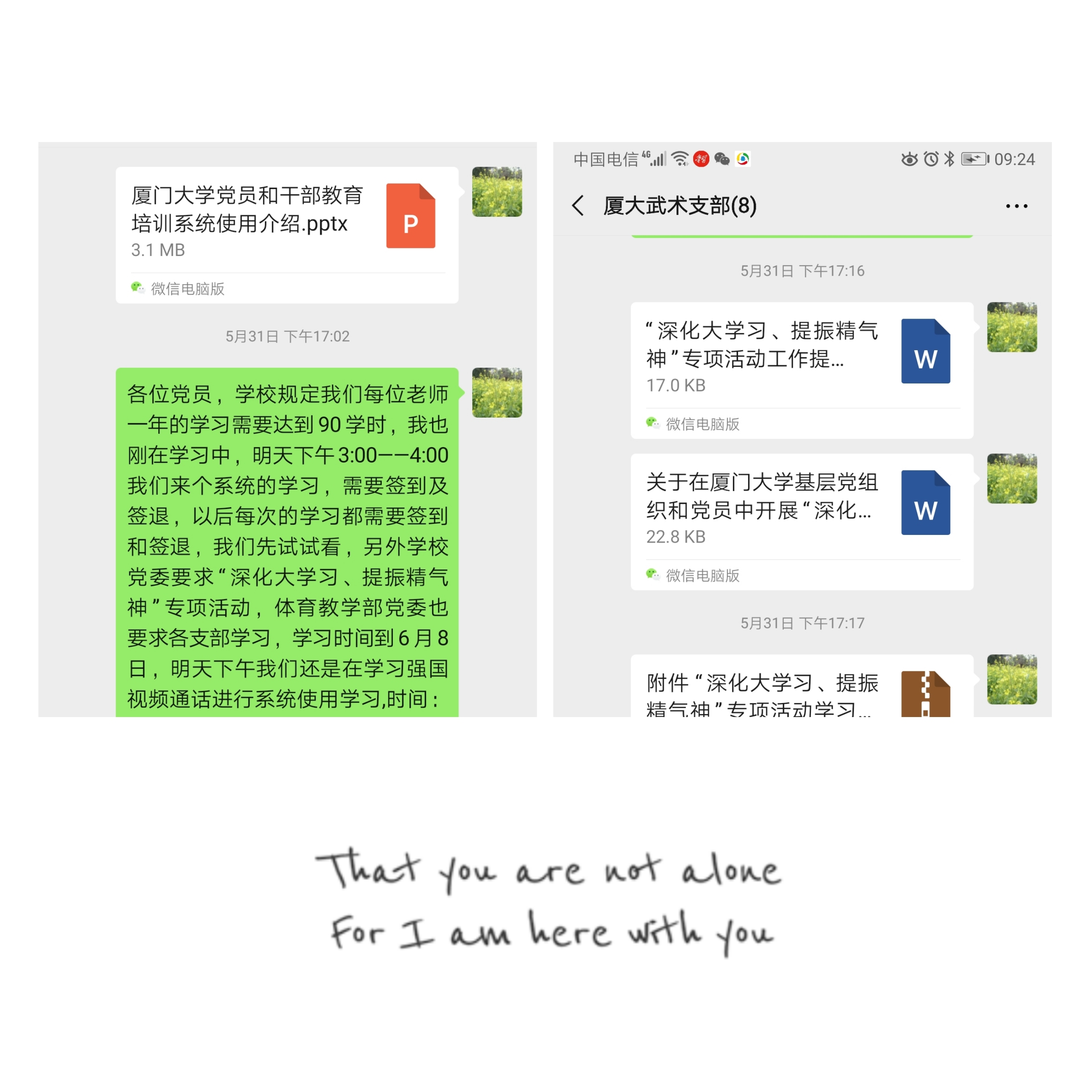 5月31日武术支部书记黄惠玲通过微信布置学习“厦门大学党员和干部教育培训系统使用介绍”及“深化大学习,提振精气神”专项活动要求,下发学习文件,通知6月1日下午及晚上的学习。
