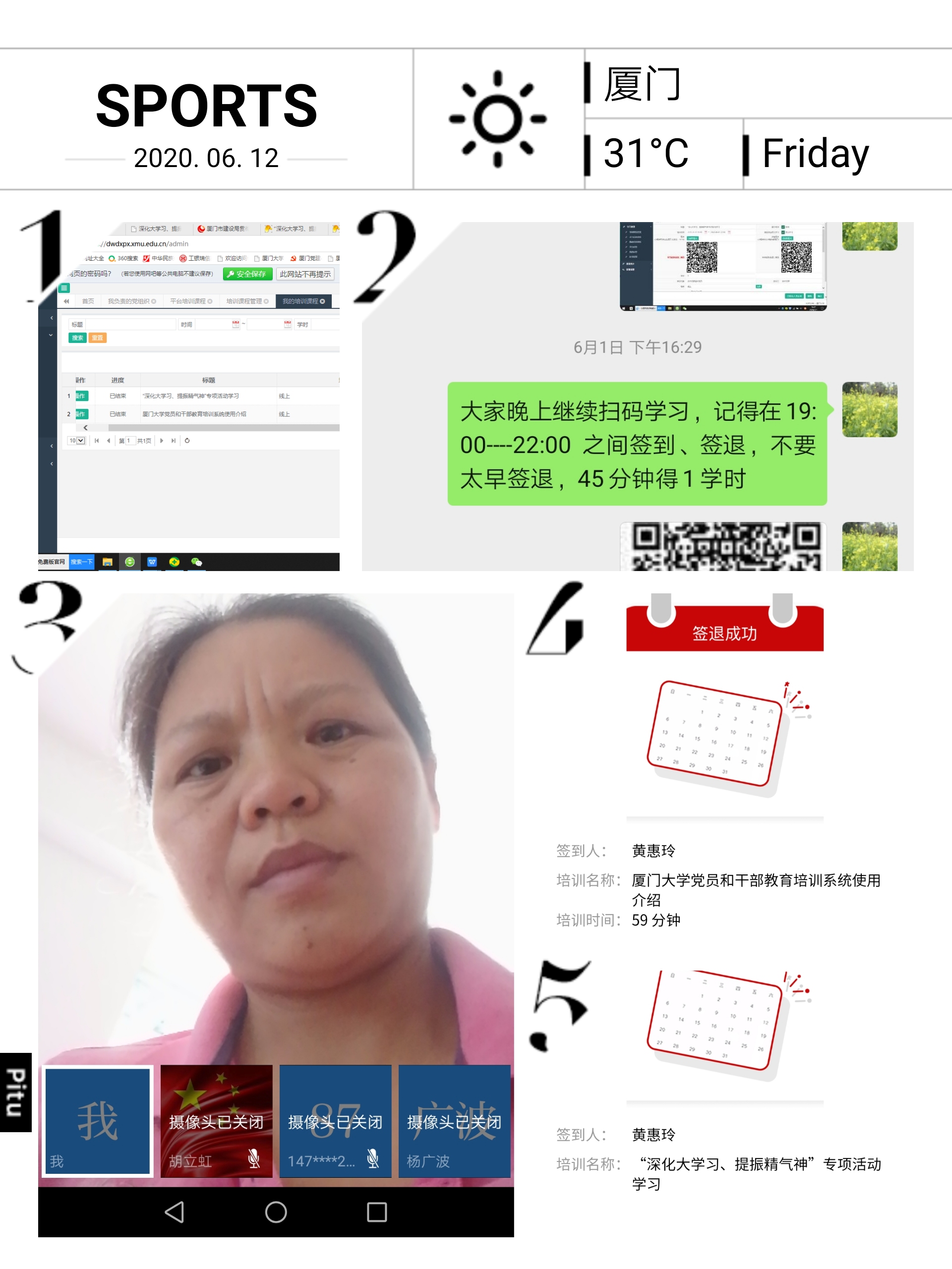 6月1日下午15:00—16:00及晚上19:00——22:00武术支部全体党员在支部书记黄惠玲组织下,通过学习强国视频会议召开了“厦门大学党员和干部教育培训系统的使用”及“深化大学习,提振精气神”的专项活动,武术支部全体党员“固定党日+”活动--“深化大学习,提振精气神”专项学习活动。