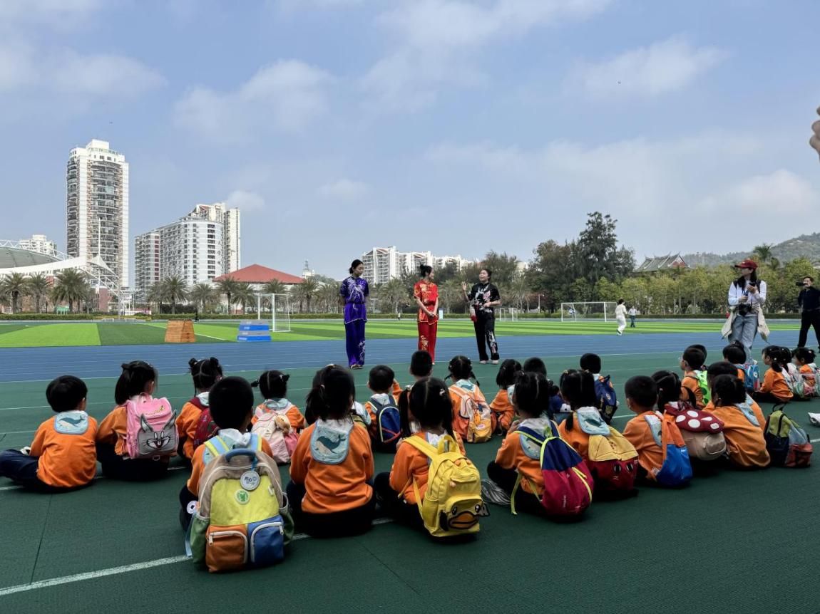武术社团紧随其后,三名社员队友身着传统武术服,身姿挺拔。在刚劲有力的招式与行云流水的动作间,将长拳的刚健迅猛、双刀的灵活多变、鞭的凌厉诡秘一一呈现,充分彰显中华武术的深厚底蕴,让小朋友们深切感受到传统文化的独特韵味。