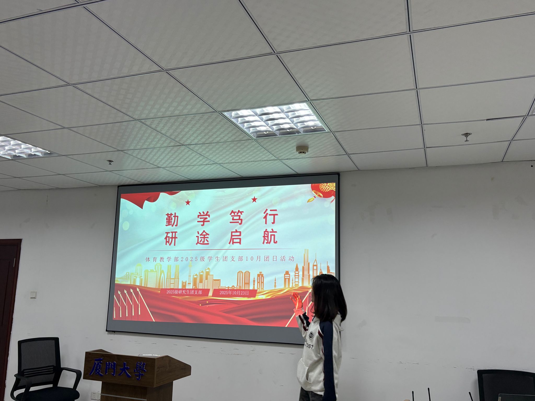 10月23日,体育教学部2025级研究生团支部以“深耕专业领域・筑牢科研根基”为主题,在演武场负二楼会议室举办主题团日活动,聚焦研究生学业适应与专业技能提升。活动由团支部书记贾司誉主持,全体团支部成员参与。