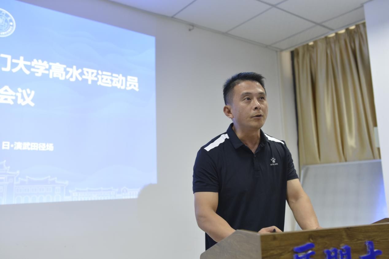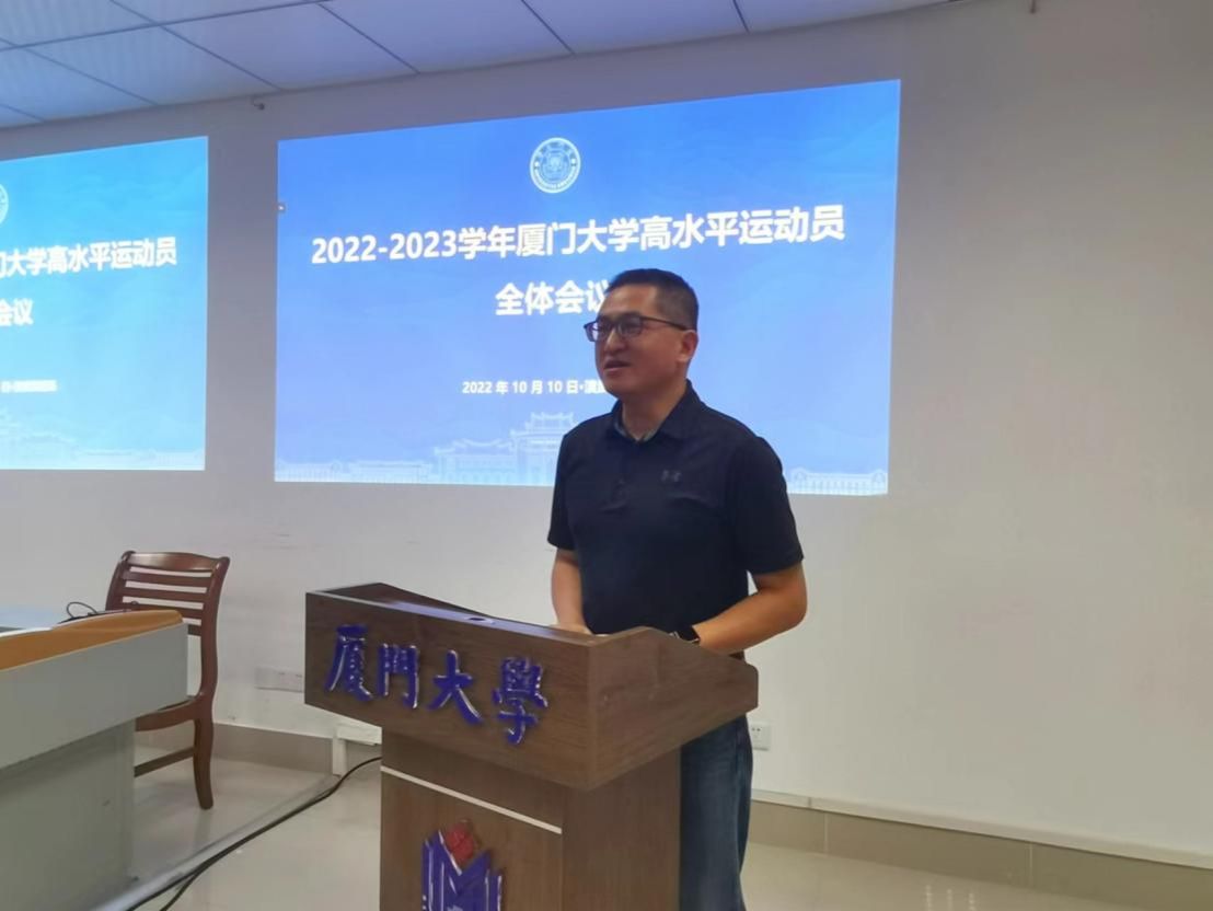 2022年10月10日下午,2022-2023学年厦门大学高水平运动员全体会议在演武田径场多媒体教室召开,体育教学部党委书记郑书东,主任林致诚,党委副书记刘建敏,副主任吴飞腾、翁兴和,竞训中心主任杨广波,团总支书记付正超和5支高水平运动队领队、教练和学生代表参加会议,会议由杨广波主持。