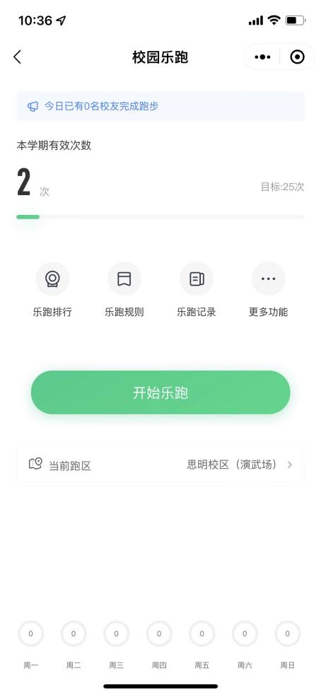 校园乐跑界面可查看今日全校跑步人数、本学期有效跑步次数含晨跑次数,以及乐跑排行、乐跑规则、乐跑记录、跑步示范、乐跑成绩、免跑申请、开始跑步、跑区信息、以及每周运动里程,如下图所示