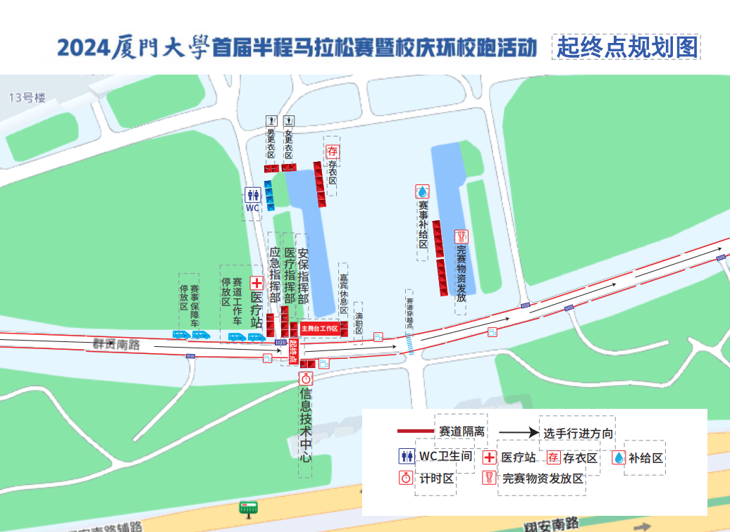 半程马拉松线路(21.0975km):厦门大学德旺图书馆起点→(按比赛线路环校三圈)厦门大学德旺图书馆终点