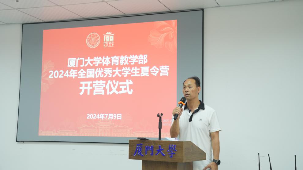 7月9日上午,厦门大学体育教学部2024全国优秀大学生夏令营开营仪式在演武田径场主席台208教室举行。体育教学部副主任翁兴和,科研与教育中心主任孟蒙,教学中心主任黄惠玲,体质健康测试中心主任邹红,群体竞赛与训练中心主任杨广波,运动健康研究与传播中心副主任黄浩洁,武术教研室主任李仁松,以及部分硕士生导师等出席。