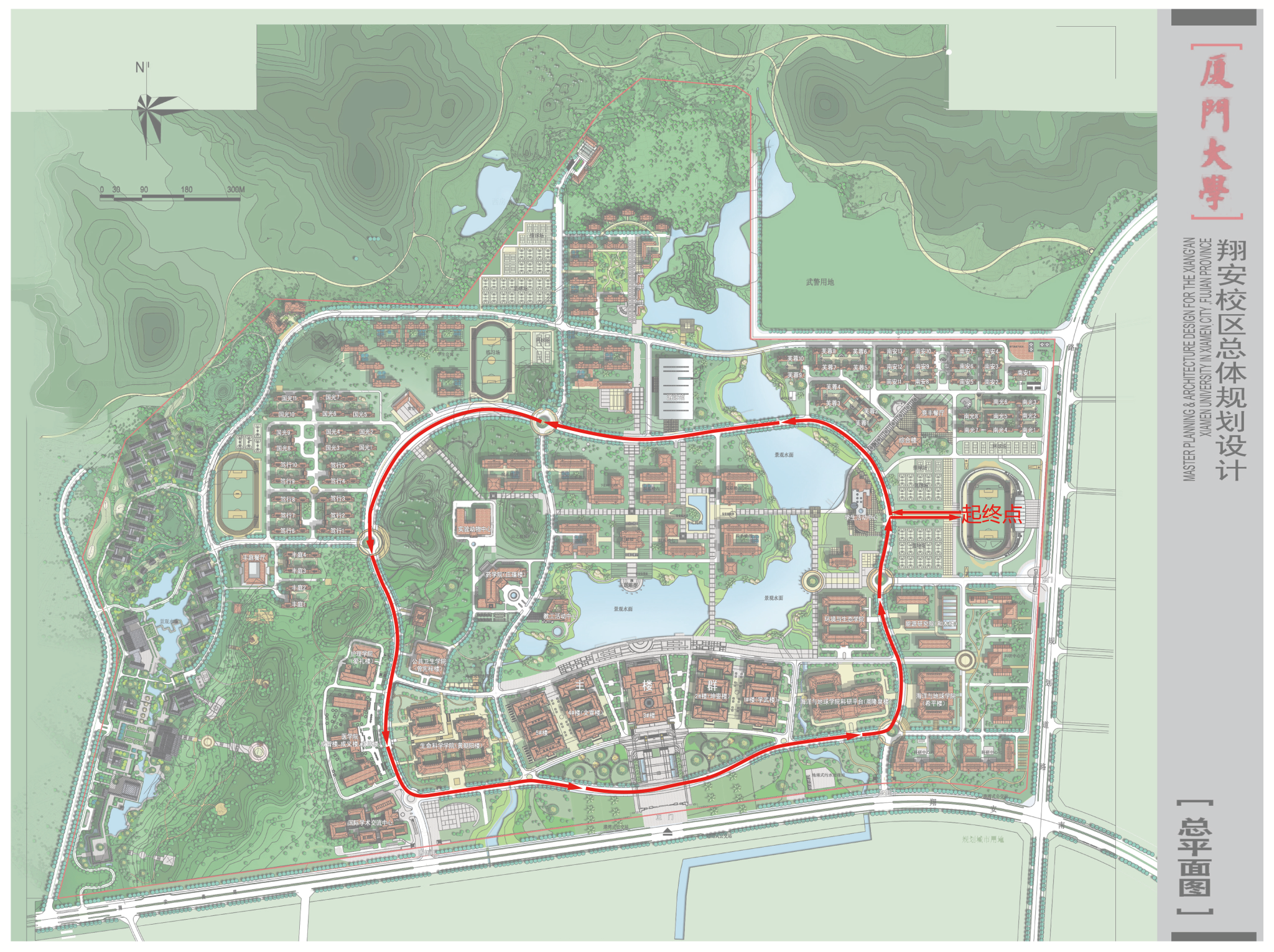 线路说明:由一期田径场出发,逆时针行210米右转,沿群贤东路途经学生活动中心、综合楼、芙蓉宿舍区,进入群贤北路,于芙蓉大桥处左转;经芙蓉大桥、游泳馆、综合体育馆,直行至国光宿舍区处左转,进入群贤西路;经笃行宿舍区、医学院,在翔安校区西侧门转盘处左转进入群贤南路;沿群贤南路靠近南侧道路经生命科学学院、主楼楼群、周隆泉楼,在翔安校区东侧门处左转;后经海洋与地球学院、能源学院,直行至学生活动中心处右转,直行从一期田径场西大门处进入跑道,沿着跑道跑至终点(总距离约4km)。