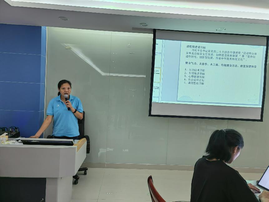 接着,A类民族传统养生课程组课程组长黄惠玲老师作了典型发言。她表示:“我们课程组一直以来严格贯彻习近平总书记在党的二十大报告中所强调的,促进群众体育和竞技体育全面发展,加快建设体育强国,要坚持创造性转化、创新型发展,传承中华优秀传统文化。”