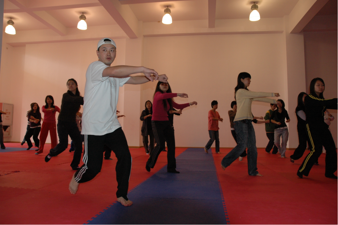 8、要求学生分组,以3-6人的小团体为单位进行成品套路的练习,培养集体配合及交流沟通能力,以互相学习、相互促进并提高。